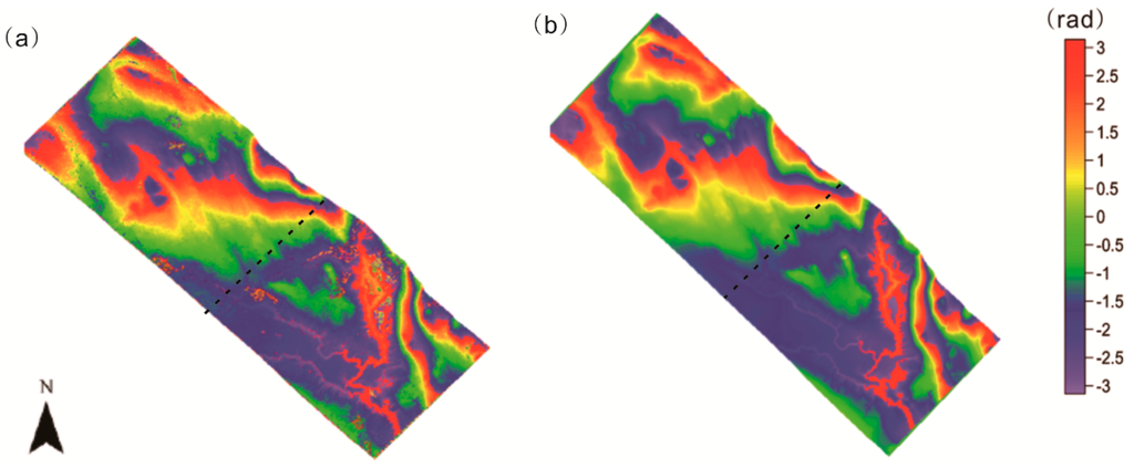 The ground phase estimated by the fitted coherence line and the reference phase obtained by using external LiDAR DEM are shown in Figure 5a,b respectively. We could differentiate the reference phase and the ground phase to analyze the accuracy of the ground phase for different forest density. However, there was an error in the area where phase changes suddenly from π to −π, as shown in Figure 5c, greatly affecting the RMSE of the ground phase. Before comparing, therefore, we needed to unwrap the reference phase and ground phase, respectively, and the corresponding result is shown in Figure 6.