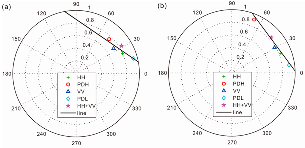 Firstly, a total least square line fitting of the complex coherence with different polarizations in a complex plane: The optional complex coherence could be the linear polarizations (HH, HV, VH, and VV) or the Pauli-basis polarizations (HH+VV and HH−VV). In some cases, the coherence sets of the linear polarizations gather together. It is difficult to get a good fitted line. Therefore, some optimized coherence channels are good choices for improving the linearity of the coherence sets [,]. For example, the phase diversity (PD) coherence optimization can get two coherence values with maximum (PDH) and minimum (PDL) phases [].
