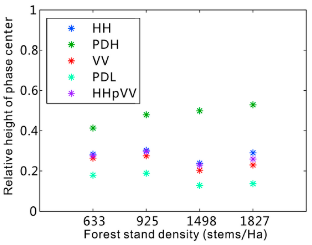 In [], the authors made a qualitatively analysis of the forest height inversion performance on the sparse pine forest by using X-band HH and HV polarizations. The obtained phase center height difference between the HH and HV polarizations in the sparse area is larger than that of the dense area, which is beneficial to achieve a more accurate forest height. This is in conflict with the trend in Figure 8. The reason is that, in the case of X-band, the phase center of HV channel is always located in the canopy for both the sparse and dense area, while the phase center of HH channel gradually declines with decreasing density because of increasing ground contribution []. However, for the P-band data used in this paper, all polarizations had considerable contributions from the ground due to strong penetration. Moreover, with the increasing density, the phase center of HV or PDH polarizations gradually rose, which caused the phase centers of different channels to separate. Therefore, the distribution of the coherence points gradually increases in the complex plane with increasing forest stand density, which is beneficial to the coherence linear fitting and the estimation of the ground phase. According to the procedures of the traditional three-stage inversion process, we find that ground phase is one of the essential parameters of the RVoG model, and accurate ground phase can make a remarkable contribution to improve the accuracy of forest height inversion.