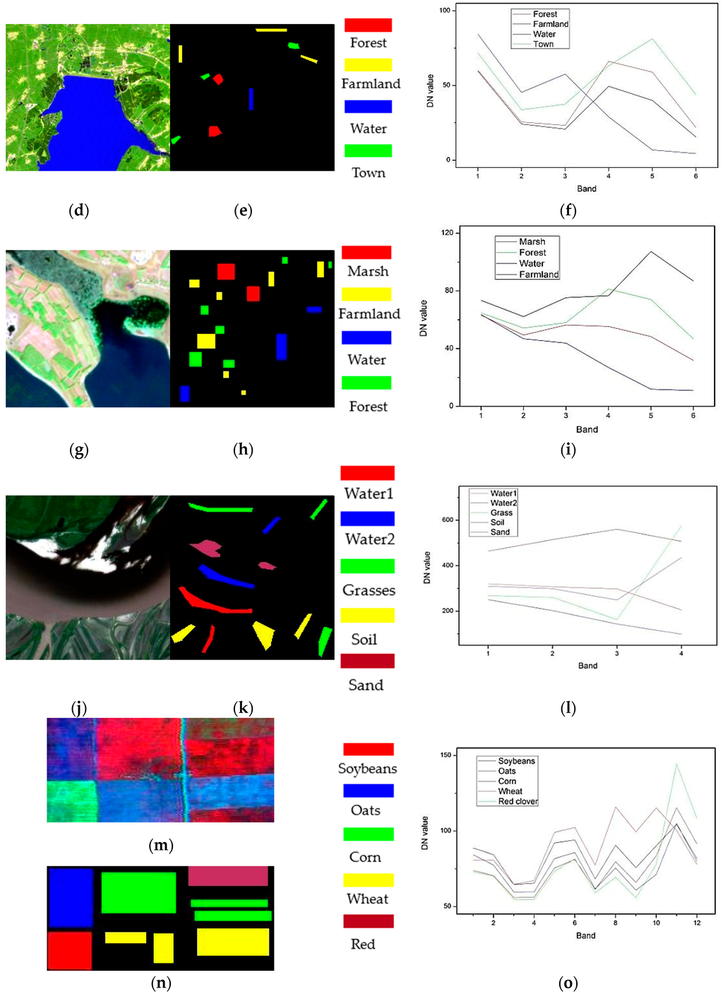The multispectral images. (a–c) the true/false color map, the ground reference map and the corresponding spectral curves of ground truth classes of QuickBird datasets; (d–f) the corresponding maps of Landsat TM datasets; (g–i) the corresponding maps of Landsat ETM+ datasets; (j–l) the corresponding maps of GaoFen-1 datasets; (m–o) the corresponding maps of FLC1 datasets. (a) True color map; (b) false color map (7, 5, 3); (c) false color map (7, 5, 3); (d) true color map; and (e) false color map (bands 12, 9, and 1).