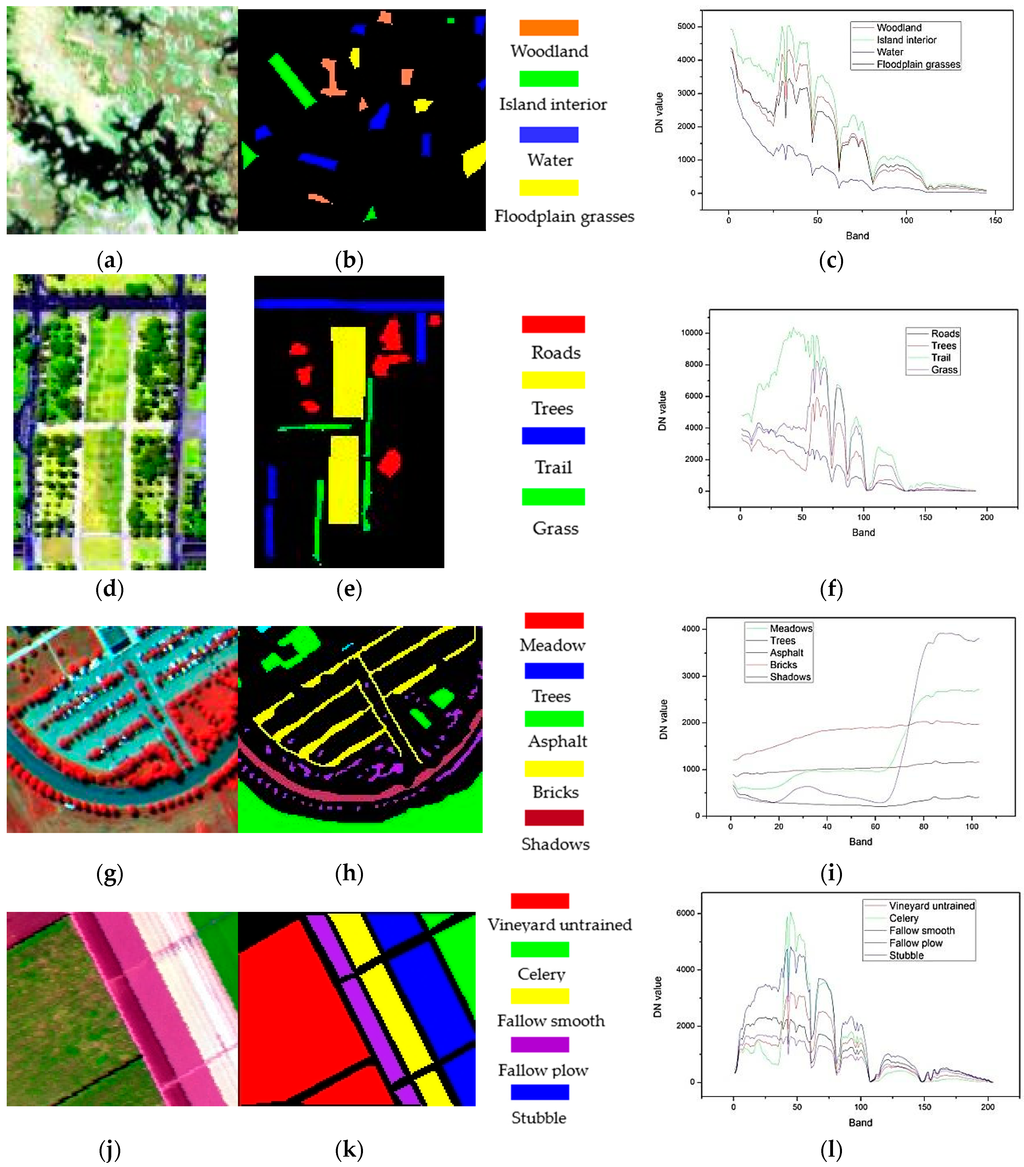 The hyperspectral images. (a–c) the false color (FC) map, the corresponding ground reference map and the corresponding spectral curves of ground truth classes of Hyperion data sets; (d–f) the corresponding maps of HYDICE datasets; (g–i) the corresponding maps of ROSIS datasets; (j–l) the corresponding maps of AVIRIS datasets. (a) FC map (bands 93, 60, 10); (b) FC map (bands 120, 90, 10); (c) FC map (bands 90, 60, 10); and (d) FC map (bands 111, 90, 12).