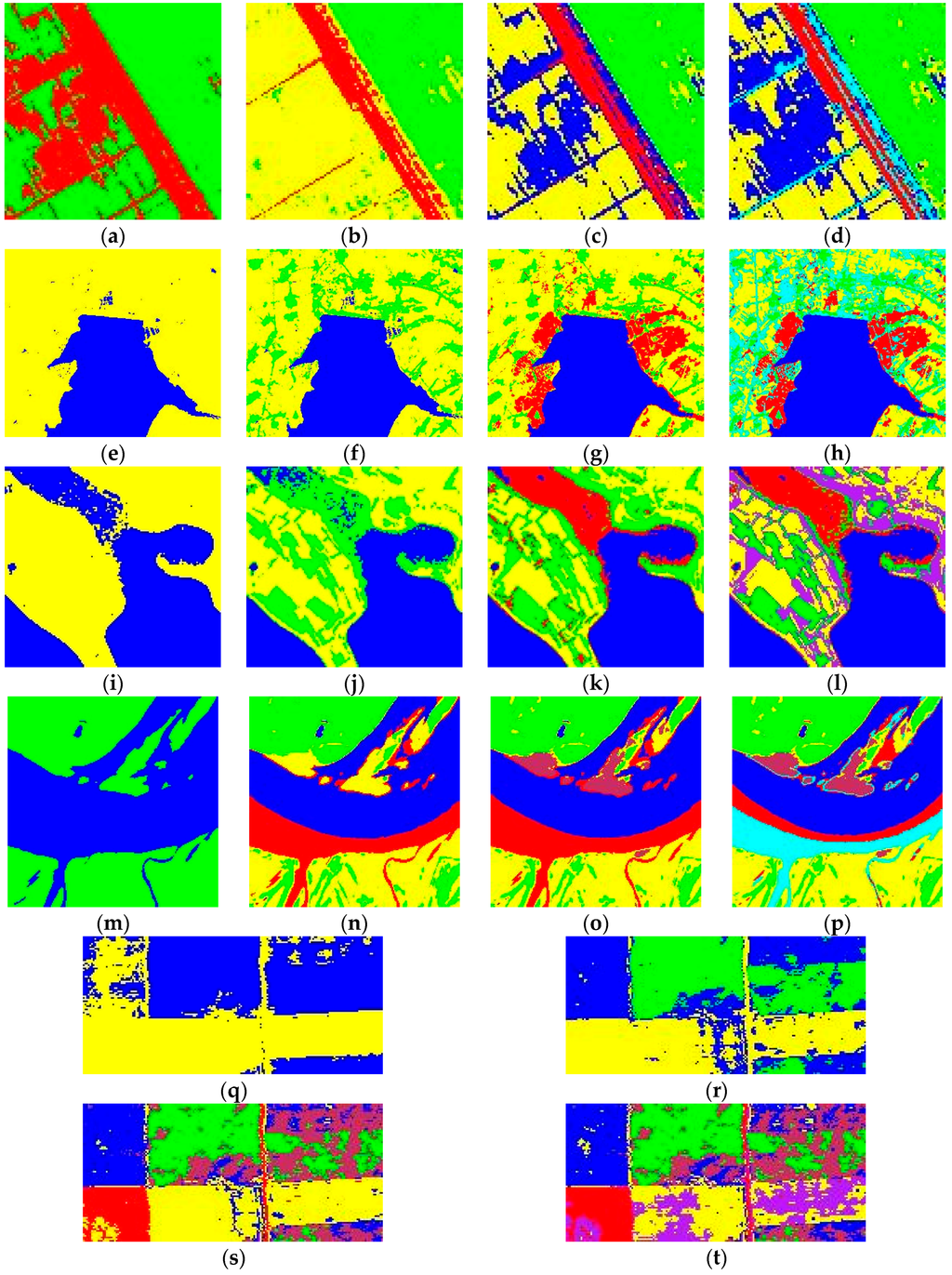 Clustering results of the multispectral images (each color represents a cluster). (a) QuickBird, K = 2; (b) QuickBird, K = 3; (c) QuickBird, K = 4; (d) QuickBird, K = 5; (e) Landsat TM, K = 2; (f) Landsat TM, K = 3; (g) Landsat TM, K = 4; (h) Landsat TM, K = 5; (i) Landsat ETM+, K = 2; (j) Landsat ETM+, K = 3; (k) Landsat ETM+, K = 4; (l) Landsat ETM+, K = 5; (m) GaoFen-1, K = 2; (n) GaoFen-1, K = 4; (o) GaoFen-1, K = 5; (p) GaoFen-1, K = 6; (q) FLC1, K = 2; (r) FLC1, K = 3; (s) FLC1, K = 5; and (t) FLC1, K = 6.