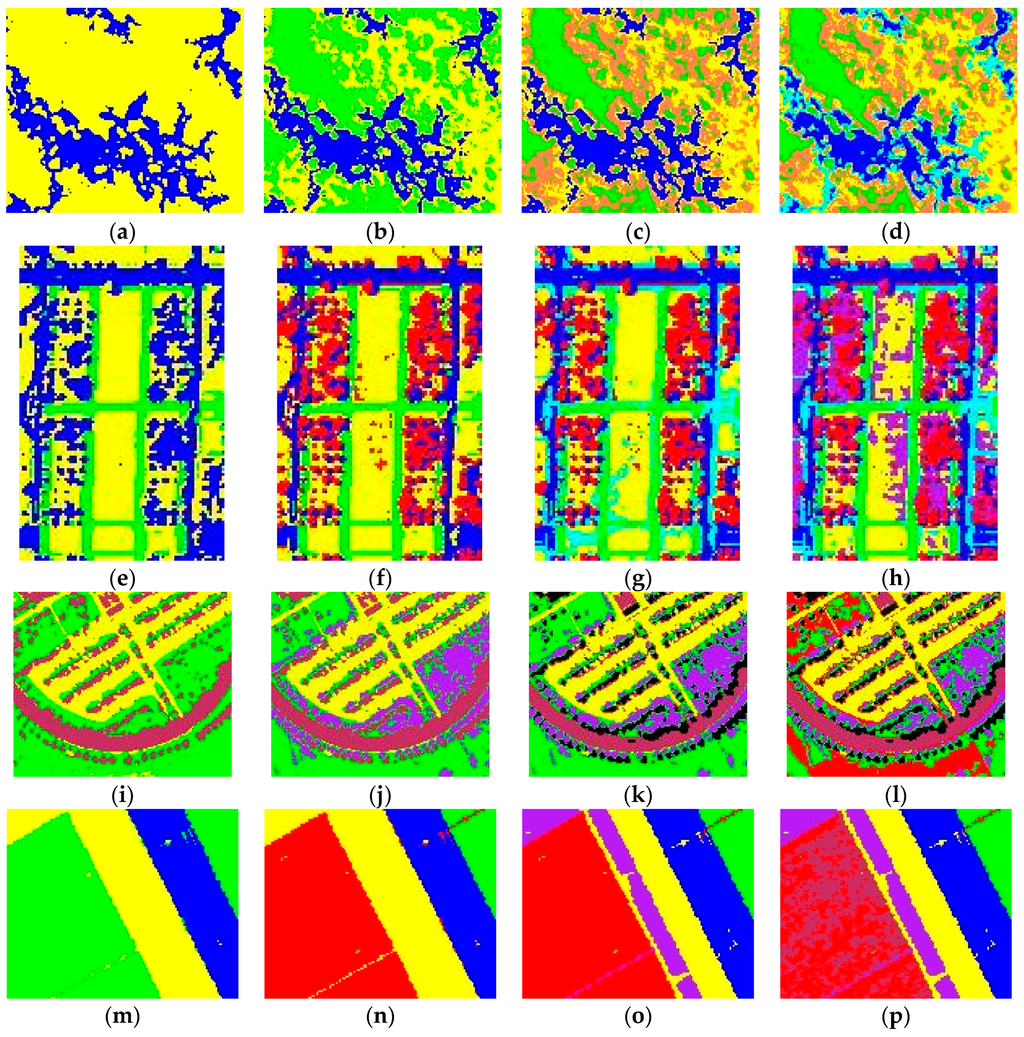 Clustering results of the hyperspectral images by FCM (each color represents a cluster). (a) Hyperion, K = 2; (b) Hyperion, K = 3; (c) Hyperion, K = 4; (d) Hyperion, K = 5; (e) HYDICE, K = 3; (f) HYDICE, K = 4; (g) HYDICE, K = 5; (h) HYDICE, K = 6; (i) ROSIS, K = 3; (j) ROSIS, K = 4; (k) ROSIS, K = 5; (l) ROSIS, K = 6; (m) AVIRIS, K = 3; (n) AVIRIS, K = 4; (o) AVIRIS, K = 5; and (p) AVIRIS, K = 6.