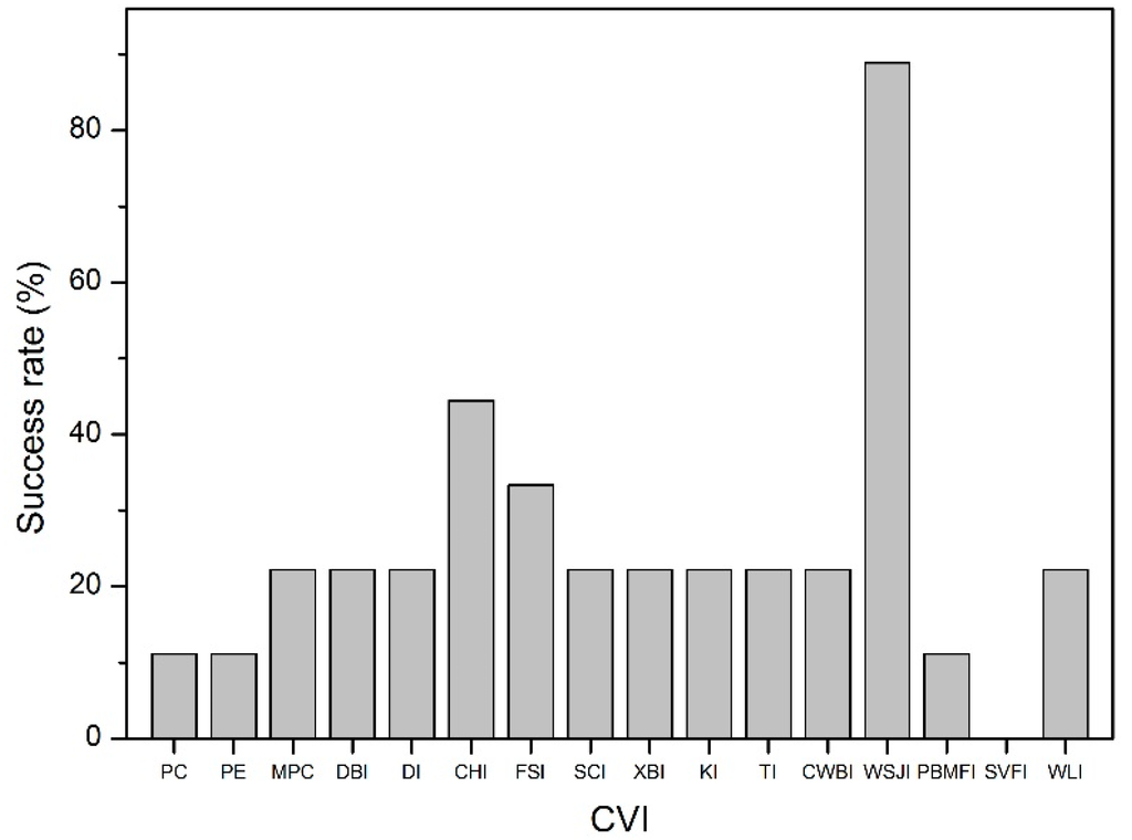 Figure 5 illustrates the percentage of successes (correct guesses) achieved by the 16 CVIs. Table 12 summarizes the cluster validity results of the 16 CVIs by FCM on nine types of remote sensing image datasets, in which the actual cluster number of each image is listed in column K# while those indicated by CVIs are shown in other columns. From the table it can be seen that WSJI was the only index that correctly recognized the actual cluster numbers of all of the datasets (including multispectral and hyperspectral data), except for the AVIRIS image. Thus WSJI, was the most effective and stable index of all. CHI and FSI succeeded in multispectral datasets but failed in hyperspectral datasets. The DBI, DI, MPC, SCI, XBI, KI, TI, CWBI, and WLI indices were only effective for two multispectral images. CVIs including PC, PE, and PBMFI failed, generally, except for the simple QuickBird experiment. SVFI failed for all images.