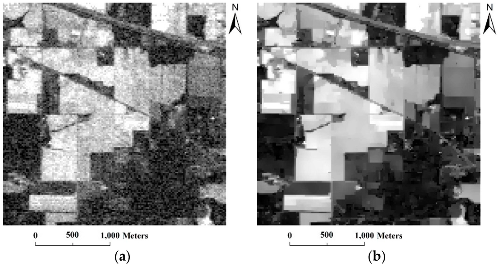 Example of the hyperspectral anisotropic diffusion PDE process for the Indian Pines data set: (a) original noisy band 185; and (b) diffused result.