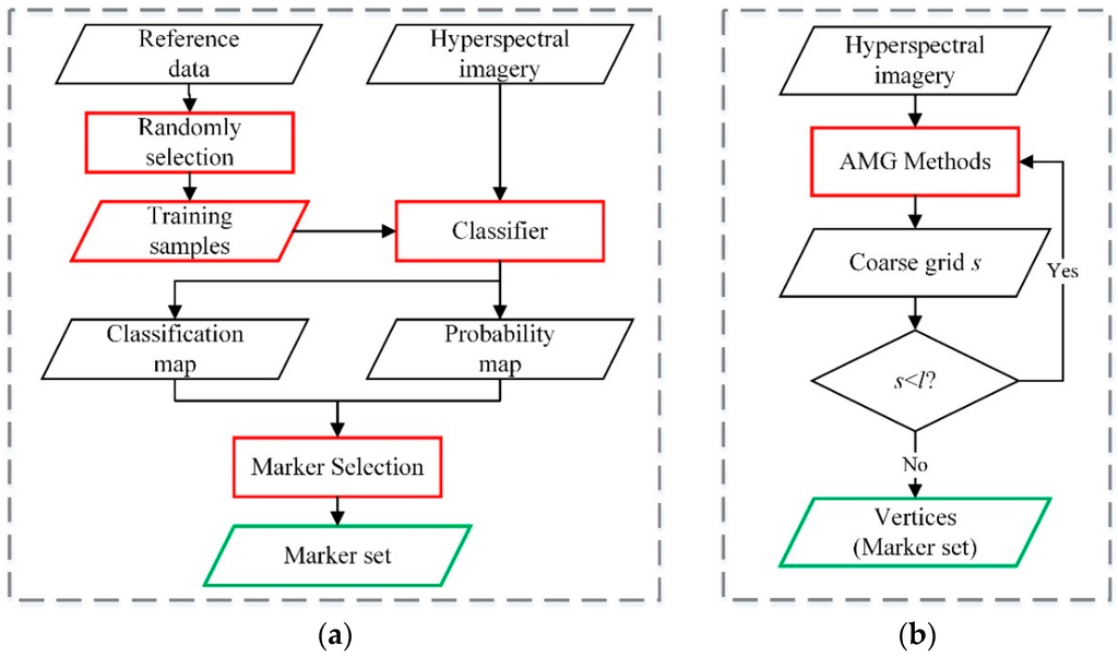 In the multigrid structure, each vertex selected by the AMG method can be exploited as a pioneer for a certain area in the hyperspectral image. The main problem is the use of the selected vertices for marker-based segmentation. In fact, we can use vertices in any grid level as the initial seeds for region growing. In [24], two automatic marker selection techniques were introduced to obtain the most reliable classified pixels as markers, i.e., marker selection approaches using morphological filtering (Morpho-MS) and probabilistic SVM (Proba-MS). To compare those two classification-derived marker selection methods with ours, flow-charts of the two schemes are illustrated in Figure 3. It can be observed in Figure 3a that the choice of markers in the classification-derived methods is always strongly dependent on the performance of the pixel-wise classifiers. Even if the same classifier is used, using different parameter settings can also produce different classification maps, which impacts the final markers. In addition, the selected markers can be very different due to the randomness of the training samples, which causes uncertainty in the classification maps. However, the final markers produced by our method are only determined by the structure of the hyperspectral image, as shown in Figure 3b, which is more robust than the traditional marker selection methods. Furthermore, the AMG-derived marker selection method requires fewer adjustment parameters than classification-derived marker selection techniques.