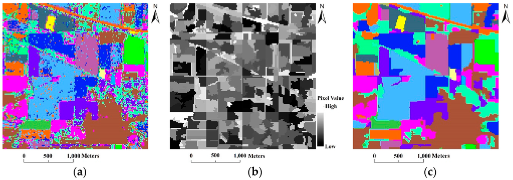 Spectral-spatial classification for the Indian Pines image using majority voting within segmentation regions: (a) the pixel-wise SVM classification map; (b) the AMG-derived M-HSEG segmentation map; and (c) the final classification map.