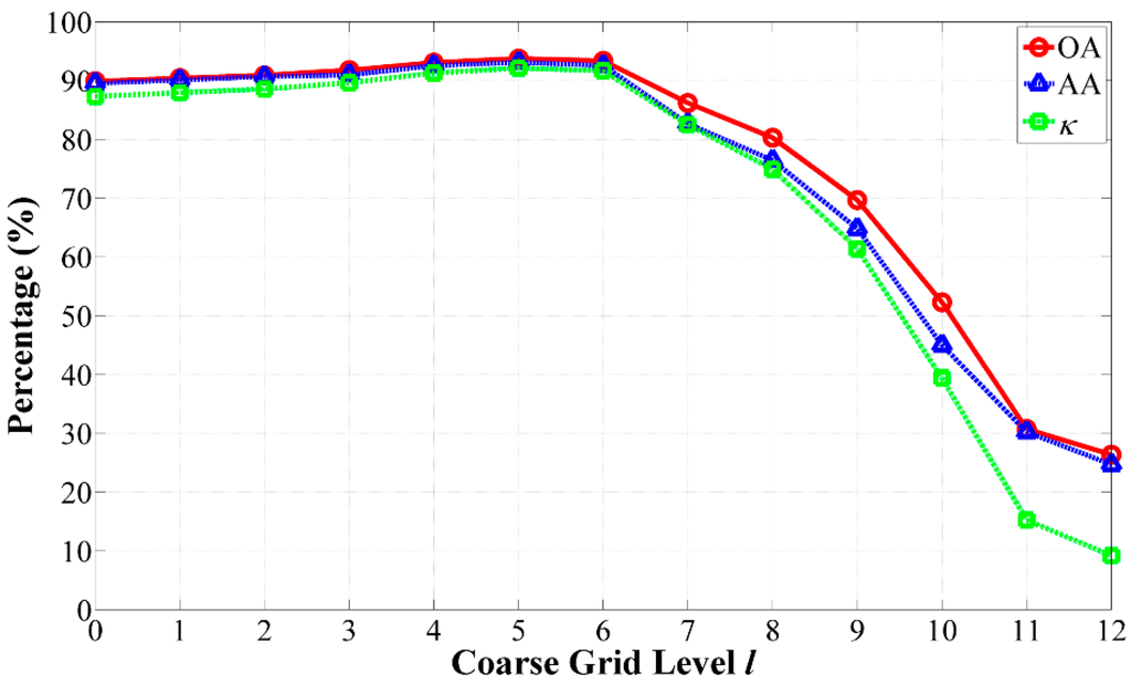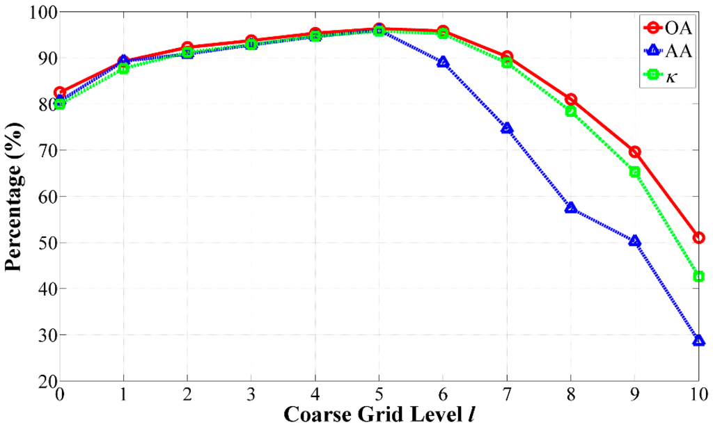 where is the index of the optimal grid level, and OA denotes the overall accuracy of our classification. It is possible to compare the resultant images by different values of l to obtain a solution to Equation (11) with the best OA value, which corresponds well with a parameter tuning procedure for marker selection.