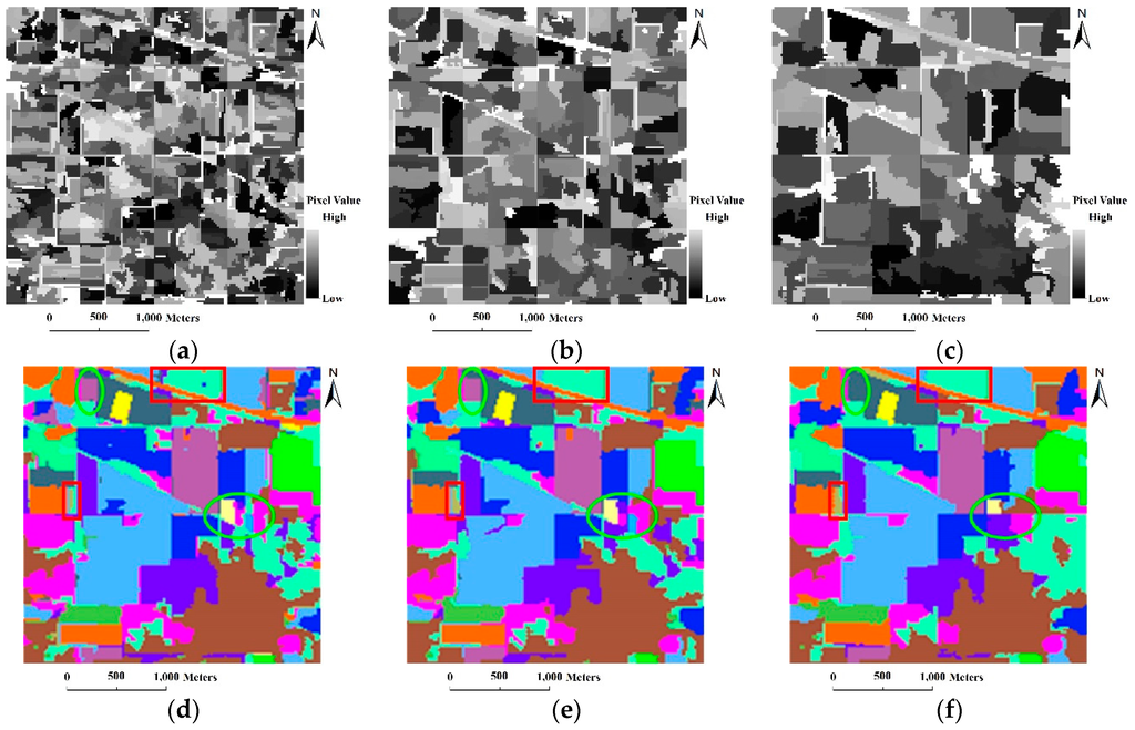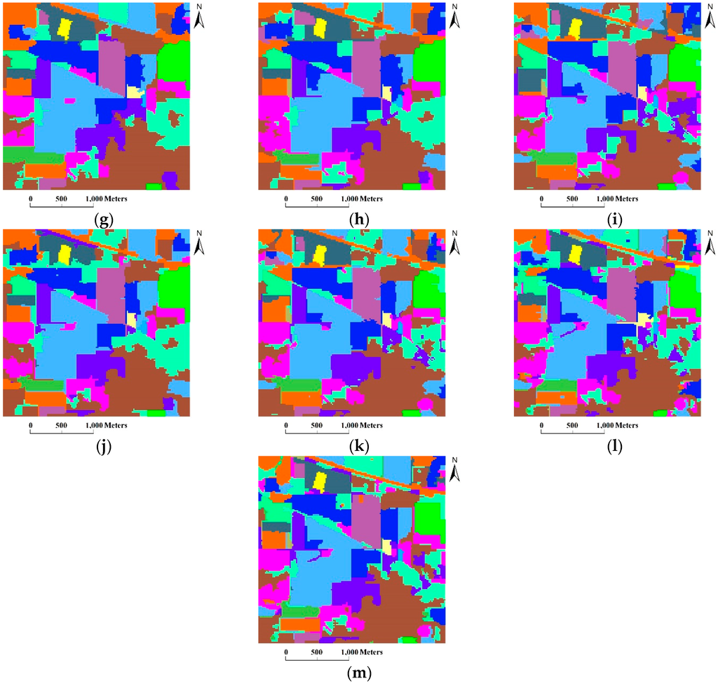 (1) The Morph-M-HSEG and Proba-M-HSEG methods, both with or without the optional majority voting step, can achieve better GAs when compared with the SVM classification. Meanwhile, the highest CAs for 6 of the 16 classes were achieved when using those four methods, including Corn-min till, Grass/trees, Grass/pasture-mowed, Hay-windowed, Soybeans-clean till and Stone-steel towers. However, those methods always resulted in a slight under-segmentation in the HSEG step. For example, it can be observed in Figure 7 that some small regions of the Corn-no till, Oats and Grass/pasture classes were merged by their adjacent regions that belonged to the other classes, or some small regions of the other classes were merged by large regions of the Corn-min and Soybean-clean classes. In contrast, in the results of our method shown in Figure 7l,m, most of the small regions that belonged to different classes were better preserved. In addition, the majority voting step did not improve the GAs and CAs of the Morph-M-HSEG method using the SAM distance because almost all the pixels in each region in Figure 7f have the same class label.