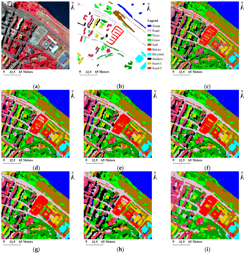 - Huang, X.; Zhang, L. A comparative study of spatial approaches for urban mapping using hyperspectral rosis images over pavia city, northern Italy. Int. J. Remote Sens. 2009, 30, 3205–3221. [Google Scholar] [CrossRef]