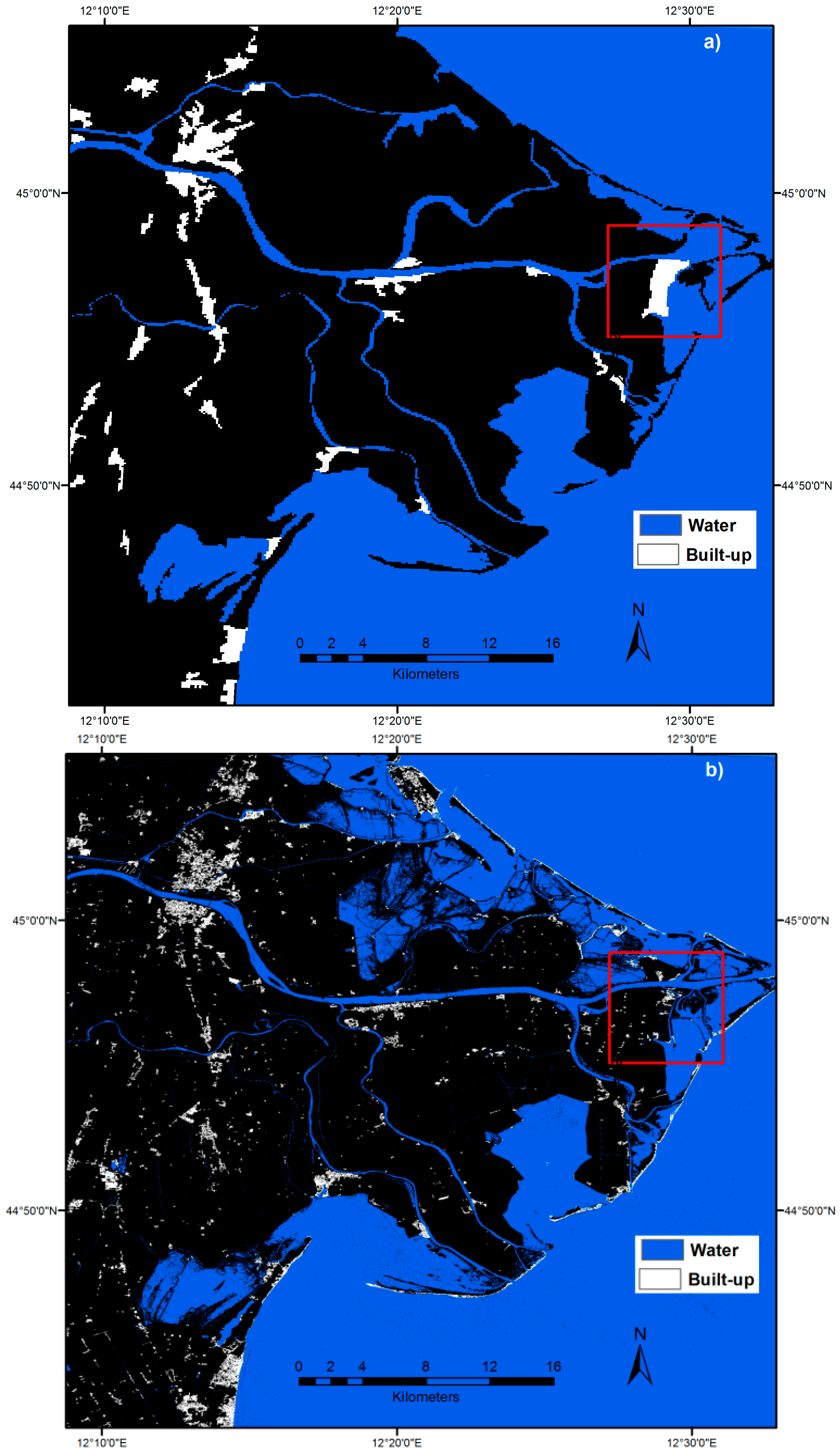 In this section, a preliminary test has been implemented with the purpose of: (i) assessing the applicability of the SML classifier to Sentinel-2 imagery; (ii) evaluating the complementarity of Sentinel-1 and Sentinel-2; and (iii) understanding the added-value of Sentinel-2 with respect to Landsat for the improvement of the global high-resolution human settlement mapping. For this experiment, a Sentinel-2 scene covering the city of Porto Viro in the area of the Po river delta, northeast of Italy was used. The study area combines both highly populated settlements and large agricultural plains with many small scattered built-up areas. The image acquired on 8 July 2015 was provided as part of the first pre-qualified expert user data released by the European Space Agency (ESA). The subset shown in