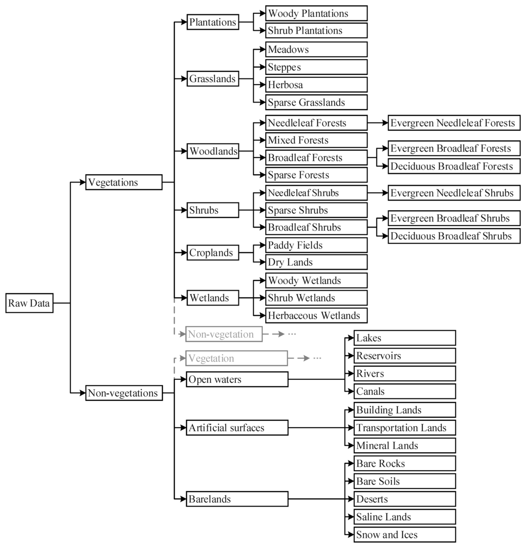 For each hierarchical structure in Figure 5, the classification errors were hard to avoid in the classification results, which could be introduced into the following hierarchical levels. Therefore, these errors in the following hierarchical level needed to be revised. For example, some non-vegetation might be confused with vegetation, so the misclassified non-vegetation needed to be extracted in the vegetation division stage as well as following stages (Dish line in Figure 5). Owing to spatial limitations, Figure 5 only shows the handling of non-vegetation and vegetation, and the handling of other land cover classes is the same.