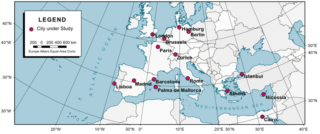In this section, the accuracy of the suggested method for TA estimation is analyzed for September 2015. To provide enough variety in the environmental conditions, all 15 cities presented in Figure 1 are included in the evaluation process. The selected regions are in different climatic zones, where the main climatic factor is either Mediterranean Sea (Cairo, Athens, Barcelona, Cyprus, Istanbul, Lisbon, Mallorca, and Rome), Atlantic Ocean (Brussels, Hamburg, London, and Paris), or the continental part of Europe (Berlin, Madrid, and Zurich).
