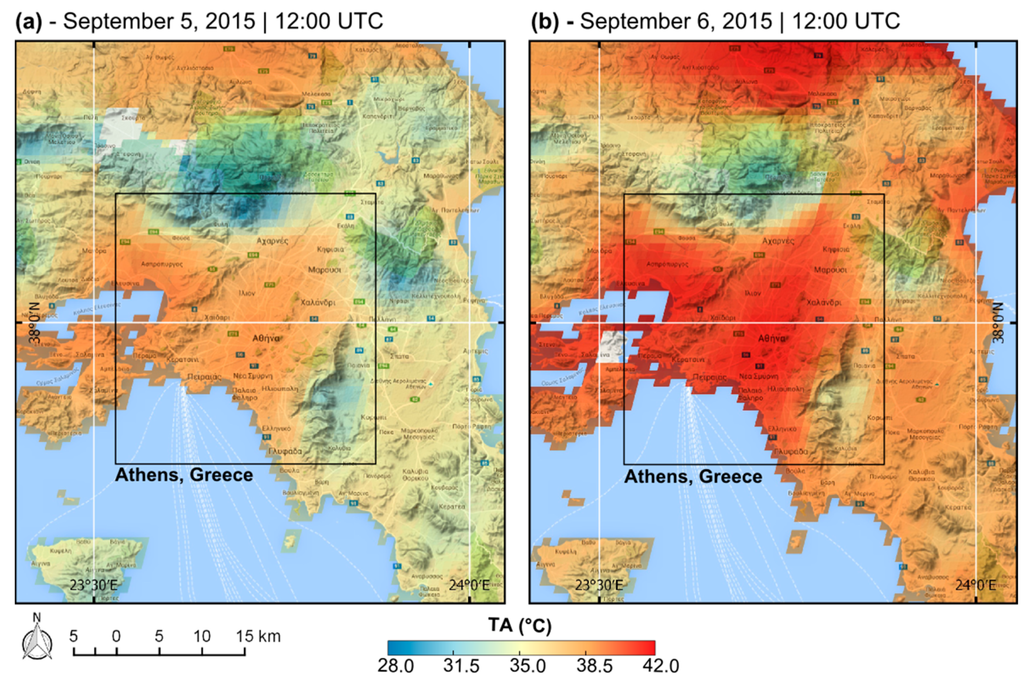 The 12:00 UTC TA products for (a) 5th and (b) 6th of September 2015 for the city of Athens, Greece. During these two days the last heatwave of Athens for summer 2015 took place (6 September was the hottest day of the heatwave). The comparison of the two maps reveals the increase of the TA values and the intensification of Athens’ UHI as captured by IAASARS/NOA system.