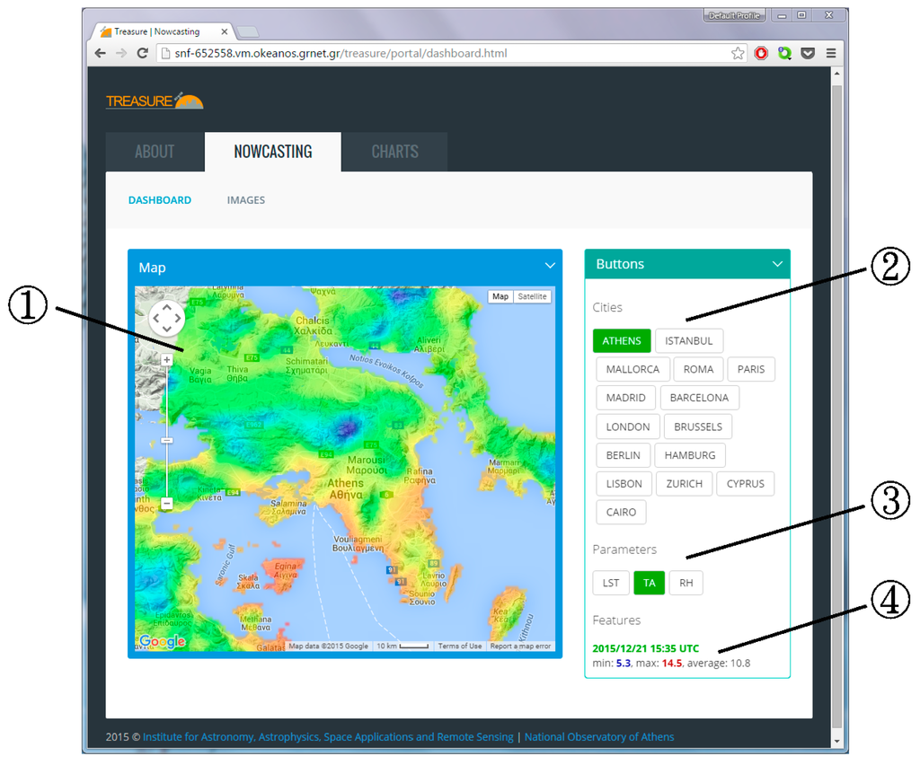The IAASARS/NOA web service for monitoring the urban thermal environment is freely accessible at http://snf-652558.vm.okeanos.grnet.gr/treasure/portal/info.html. The IAASARS/NOA web service offers two major features: the nowcasting dashboard that presents the most recently generated images, and the charts webpage that presents the archived data and offers various functionalities, such as the comparison of TA data between various cities and the comparison of various parameters for the same city. These two features are presented below.