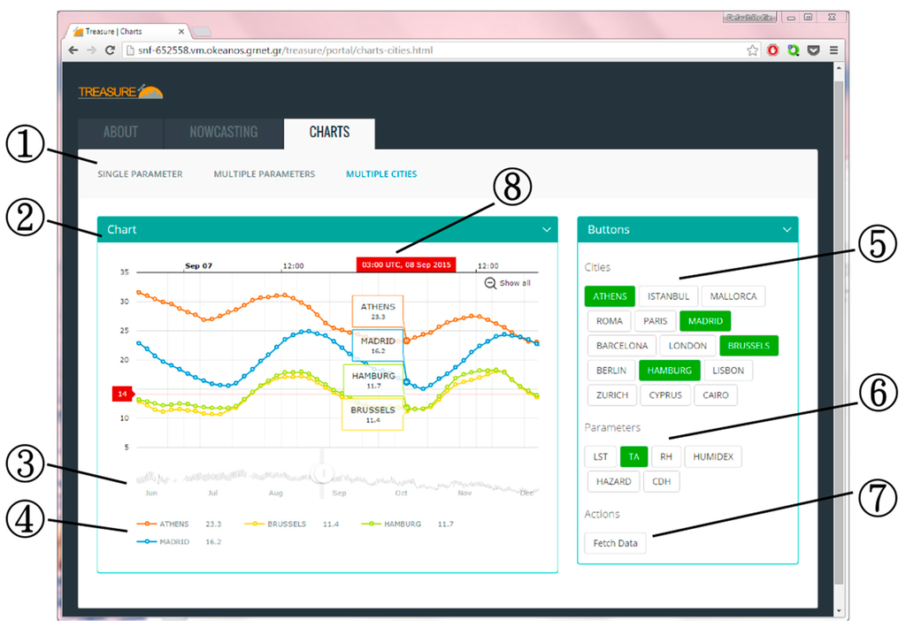 The graphical interface of the charts/multiple cities webpage. ① is the chart type selection menu; ② is the chart display window; ③ is an overview of the selected time series; ④ is the chart legend; ⑤ is the city selection menu; ⑥ is the parameter selection menu; ⑦ is the action button for plotting the selected parameters; and ⑧ is a dynamic label presenting the date, time, and parameter values for the plot point closest to the mouse cursor.
