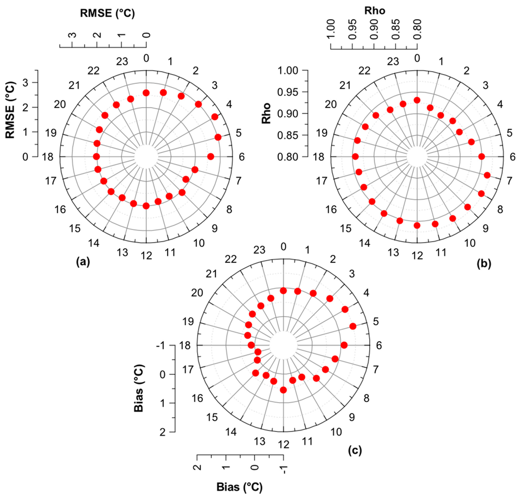 Figure 5 presents the RMSE, Rho, and bias for each hour aggregated over all areas. The diurnal variation shows, that during daytime, RMSE is most of the time just below 2 °C, but its value rises during nighttime. Rho, on the other hand, is high during daytime, especially before noon as it reaches values over 0.97, but it drops down during the night to a lowest value of 0.85.