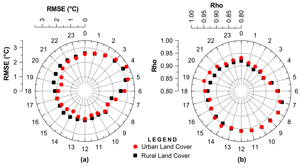 The diurnal variation of TA (a) RMSE and (b) Rho for urban and rural pixels.