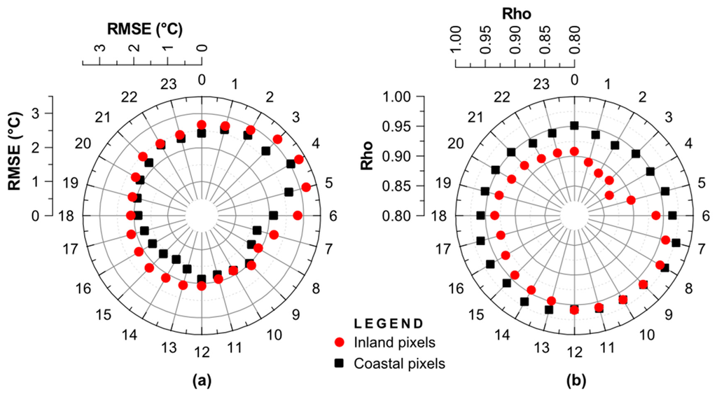 The diurnal variation of TA (a) RMSE and (b) Rho for inland and coastal pixels.