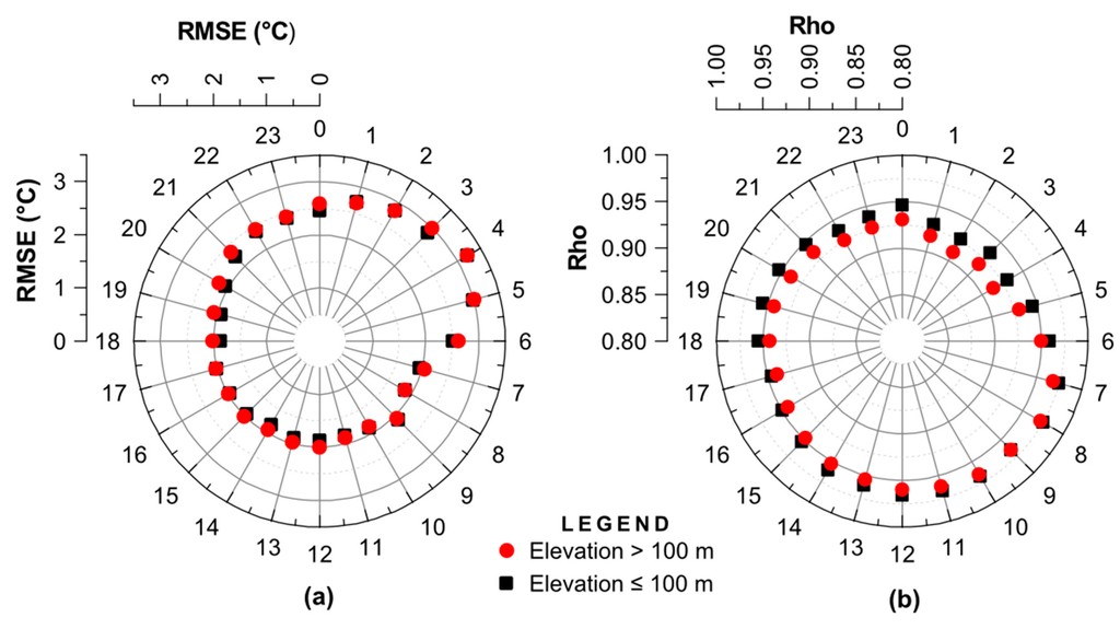 Due to the interesting contrast in accuracy during nighttime and daytime, the diurnal variation of the accuracy according to land cover type was assessed next. The comparison between urban and rural land cover, which is presented in Figure 6, shows a similar trend as in Figure 5. There is no significant difference except in the late afternoon/early evening, as urban areas seem to have better accuracy. More systematic influence is seen when the stations are classified according to the distance to water (Figure 7). Areas closer to water seem to have better accuracy almost all day long except in the late morning. The highest accuracy (~1.5 °C) is achieved during the warmest hours of the day. However, the general trend is for both classes the same as for the whole dataset—better accuracy during daytime than during nighttime. The elevation also has a small, but a clear, influence on results (Figure 8). The lowest elevations, many of them are also close to sea, are more accurate almost each hour of a day. The difference of RMSE between the two classes shown in Figure 8 is never larger than 0.5 °C. However, the difference of Rho is higher especially during nighttime.