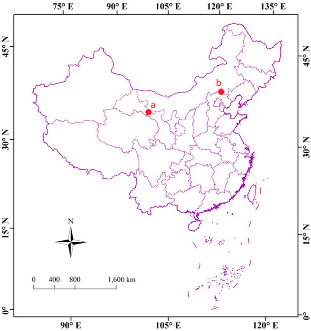 The Dayekou watershed of Zhangye, Gansu Province, and Saihanba National Forest Park of Weichang, Hebei Province were chosen as study areas, as shown in Figure 1. Zhangye is in the middle and upper reaches of the second largest inland river of China, the Heihe River, characterized by a dry continental climate. Its mean annual precipitation is less than 200 mm, but the (potential) annual evaporation is more than 2000 mm, and the annual mean temperature is 1.5–2.0 °C. The Dayekou watershed (latitude and longitude: 38°26′13″–38°34′26″ N and 100°13′10″–100°18′52″ E, respectively) is in the Qilian Mountains of northwestern China. This region is at approximately 3000 m altitude and has a rugged terrain. The research object, Picea crassifolia, a species of conifer in the Pinaceae family endemic to China, is widely distributed throughout this region. P. crassifolia grows on the shaded slope of valleys or vales at altitudes from 1600 m to 3800 m. Other types of land cover in this region include bare surface, water bodies, snow, and settlements. Grass is absent in May.