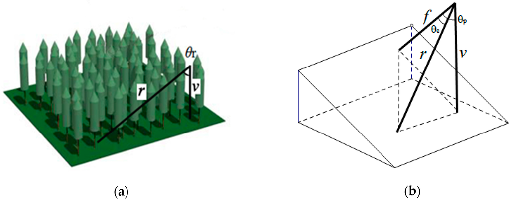 The effect of slope: (a) Effective canopy depth in the horizontal area; (b) Effective canopy depth in the slope area. r: effective canopy depth; v: height of the plant; f: normal of the slope.