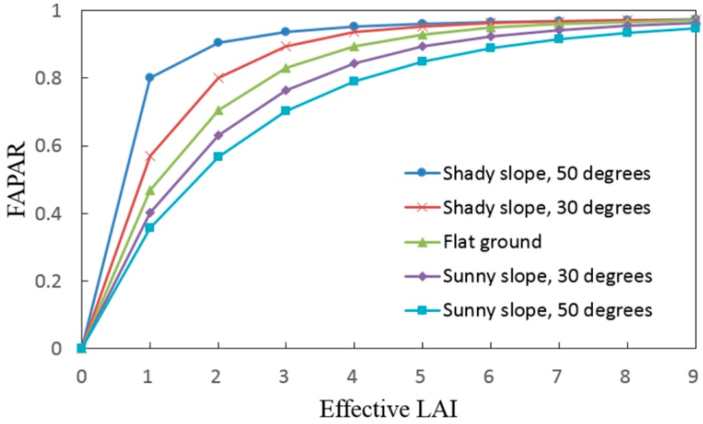 The relation between the fraction of absorbed photosynthetically active radiation (FAPAR) and the effective leaf area index (LAI) at different slopes and aspects.