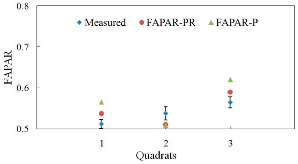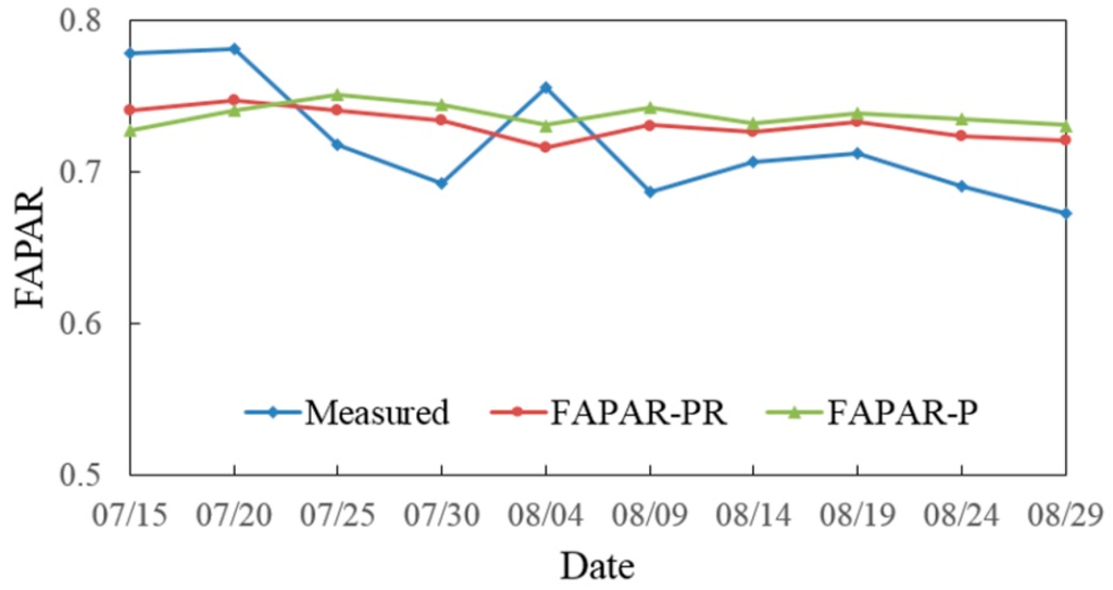 From Figure 7, it can be seen that the difference between the measured FAPAR and the model FAPAR calculated using the FAPAR-PR is small, indicating the feasibility of the FAPAR-PR model. The FAPAR values calculated using the FAPAR-PR are closer to the measured values than the FAPAR values calculated using the FAPAR-P. However, the values of model FAPAR from the FAPAR-P and FAPAR-PR are quite close to each other.