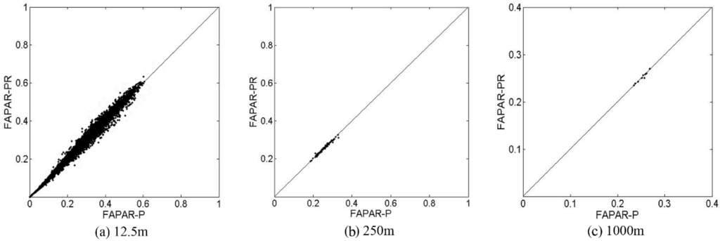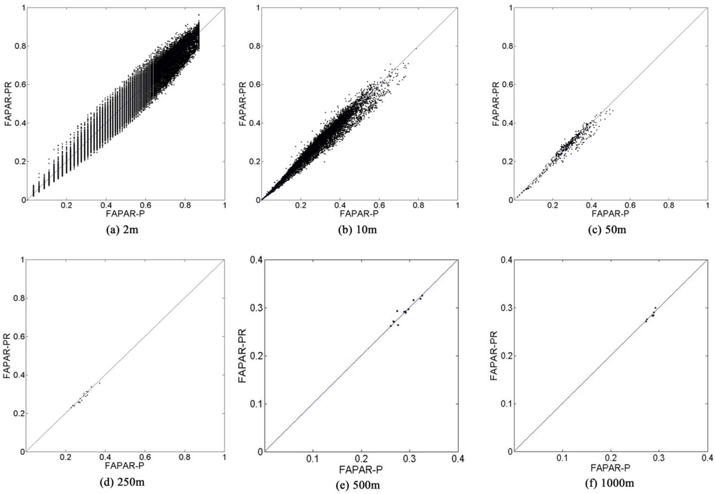 As with other vegetation parameters, the FAPAR retrieved from satellite imagery also suffers from the scaling effect [35,36]. In this study, we attempted to only evaluate terrain effects on the FAPAR calculation at different scales by comparing the FAPAR values calculated using the FAPAR-PR and FAPAR-P models at different scales. The results for Dayekou and Saihanba are shown in Figure 12 and Figure 13, respectively.