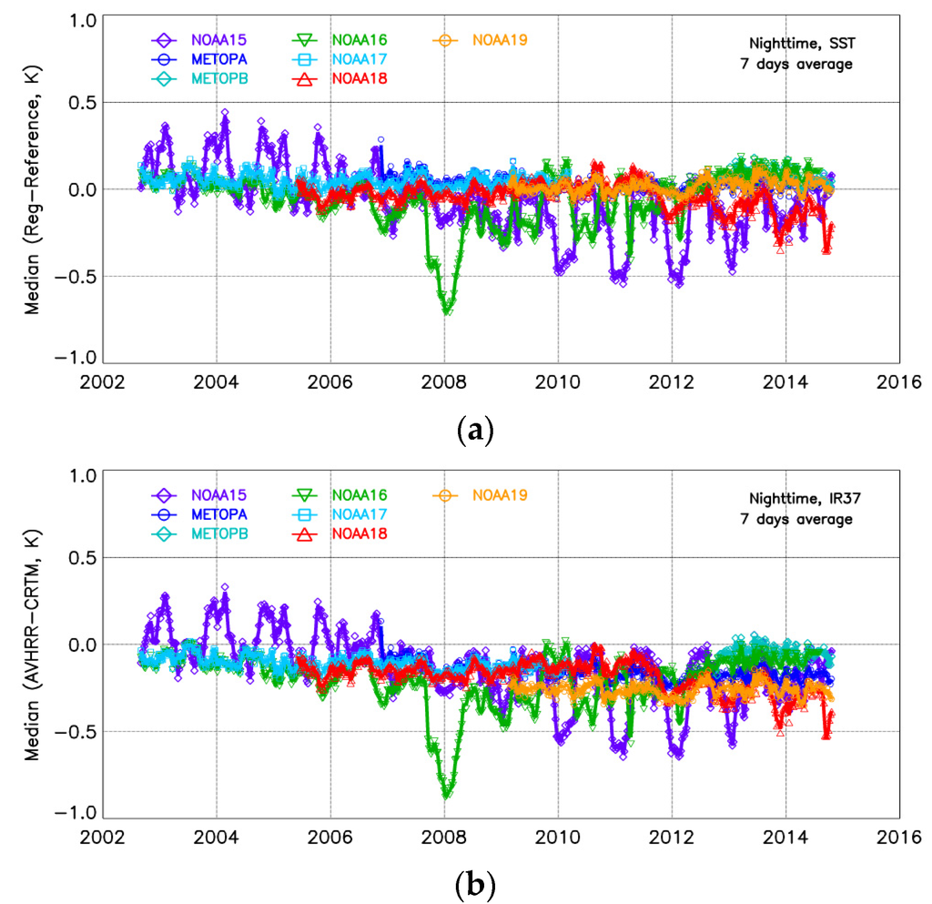- Liang, X.; Ignatov, A. AVHRR, MODIS, and VIIRS radiometric stability and consistency in SST bands. J. Geophys. Res. 2013, 118. [Google Scholar] [CrossRef]
