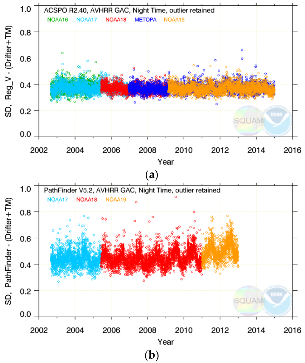 At this time, the AVHRR sensor calibration remains the major limitation to the SST performance in RAN1. In particular, the data in Figure 2 unambiguously support the major recommendation in the NRC (2004) report on satellite climate data records (CDR) [23] which states that high quality fundamental climate data records (FCDRs; the AVHRR BTs) are a prerequisite for the high quality thematic climate data records (TCDRs; the SST). To that end, the current priority is to better understand and resolve the root causes of the unstable AVHRR calibration and generate an improved AVHRR/3 FCDR [14], at which time the need for the variable regression coefficients will be minimized and a more stable SST TCDR (ACSPO RAN) will be produced.