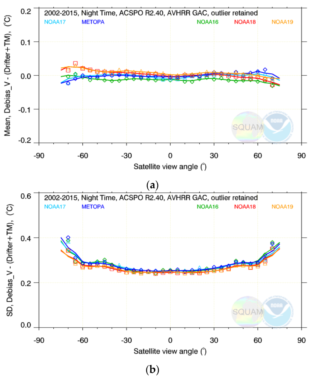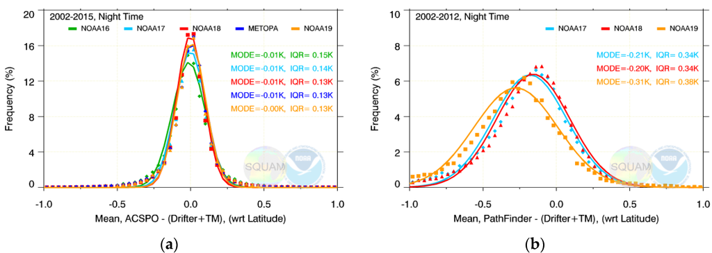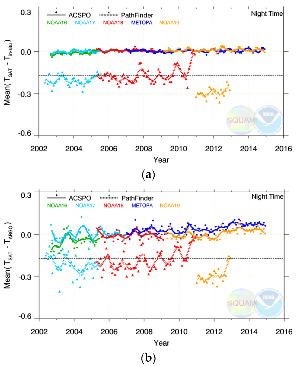 The time series of nighttime mean ΔTS are shown in Figure 1a as they appear in the NOAA SQUAM system. For some platforms, the derived SSTs are stable and close to in situ SSTs, for the full time of their operation (e.g., Metop-A and -B, and NOAA-17 and -19). For some others, the initial periods of stability alternate with periods of uncontrolled variations (e.g., NOAA-16 and -18). And yet for some others, the SSTs are unstable for the full period from 2002 to present (e.g., NOAA-15).