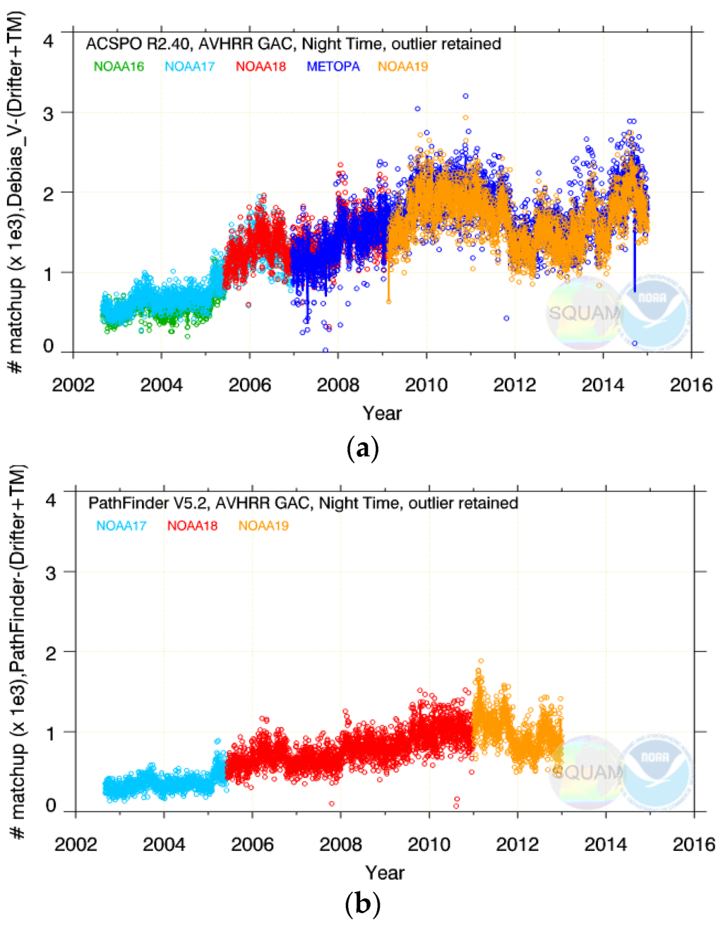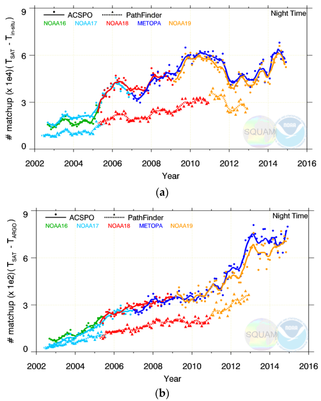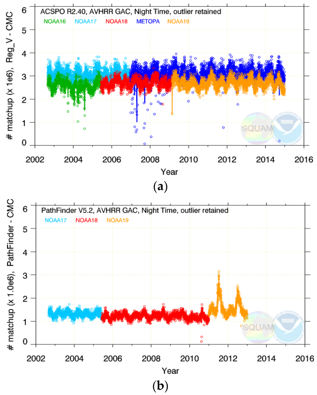 The time series of nighttime mean ΔTS are shown in Figure 1a as they appear in the NOAA SQUAM system. For some platforms, the derived SSTs are stable and close to in situ SSTs, for the full time of their operation (e.g., Metop-A and -B, and NOAA-17 and -19). For some others, the initial periods of stability alternate with periods of uncontrolled variations (e.g., NOAA-16 and -18). And yet for some others, the SSTs are unstable for the full period from 2002 to present (e.g., NOAA-15).