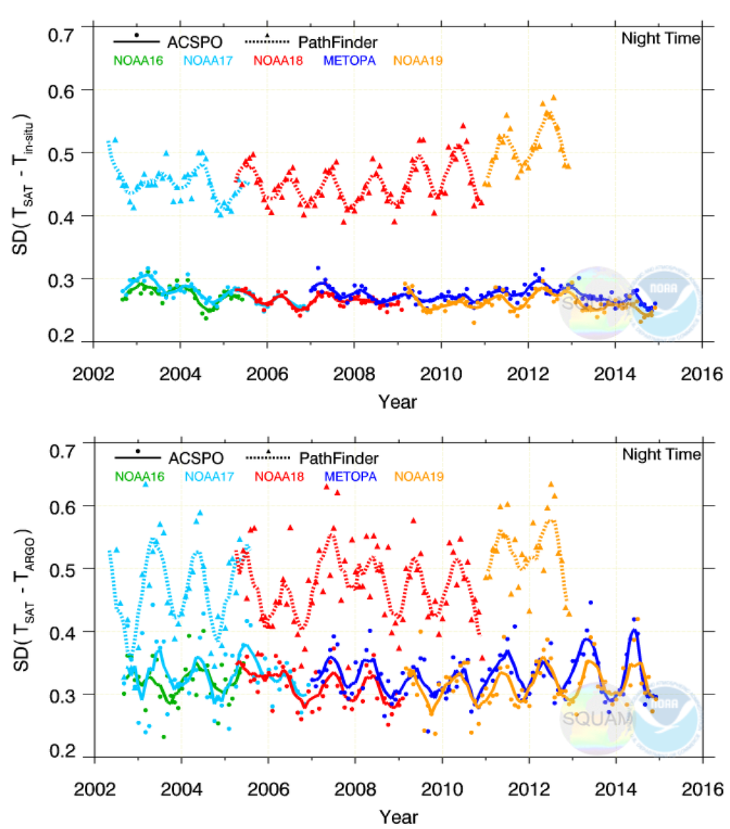 The Advanced Clear Sky Processor for Ocean (ACSPO) is the NOAA sea surface temperature (SST) retrieval system [1,2,3,4]. It is currently employed to produce operational polar SST products from several Advanced Very High Resolution Radiometers (AVHRRs) onboard the US’ NOAA and European Organization for the Exploitation of Meteorological Satellites (EUMETSAT) Metop satellites, and from the new Visible Infrared Imager Radiometer Suite (VIIRS) onboard the Suomi National Polar-orbiting Partnership (S-NPP) platform. Two experimental SST products—from the Advanced Himawari Imager (AHI) onboard the geostationary Japanese Meteorological Agency (JMA) Himawari-8 satellite, and from two Moderate Resolution Imaging Spectroradiometers (MODIS) onboard the NASA Terra and Aqua polar satellites—are also produced at the NOAA Center for Satellite Applications and Research (STAR).