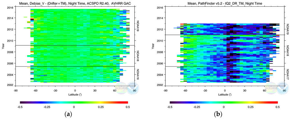 Figure 2b shows ΔTB’s in band 3b corresponding to the ΔTS’s in Figure 2a. The two time series strongly correlate, suggesting that the major reason for the SST artifacts in Figure 1a and Figure 2a are the unstable AVHRR BTs (cf. [13]). The root cause of the unstable BTs is suboptimal AVHRR calibration [14]. Work is underway to generate an improved AVHRR Level 1b dataset, and use it in ACSPO RAN. In the meantime, the main focus of RAN1 was on improving the stability of SST time series using the most stable sensors and periods of their operation, and employing variable SST regression coefficients.