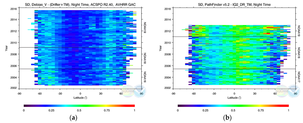 Figure 7 re-plots the time series of the SST biases and SDs from Figure 3a and Figure 4a, respectively, but after the SSES bias correction has been applied. This results in reduced SST biases with respect to in situ data (~±0.05 K vs. ±0.10 K in Figure 3a), smaller SDs (0.20–0.35 K vs. 0.30–0.45 K in Figure 4a), and overall improved stability and cross platform consistency of RAN1 SST. Therefore we recommend that in any data assimilation applications of RAN1 data, especially those blending together satellite and in situ data, and targeting “bulk” SST L4 products (such as the “foundation”, e.g., CMC SST) the SSES bias correction be applied. Also, the RAN1 data may be assimilated in analyses with weights depending on the SSES SDs (e.g., inversely proportional to their squares, see e.g., [16] and references therein).