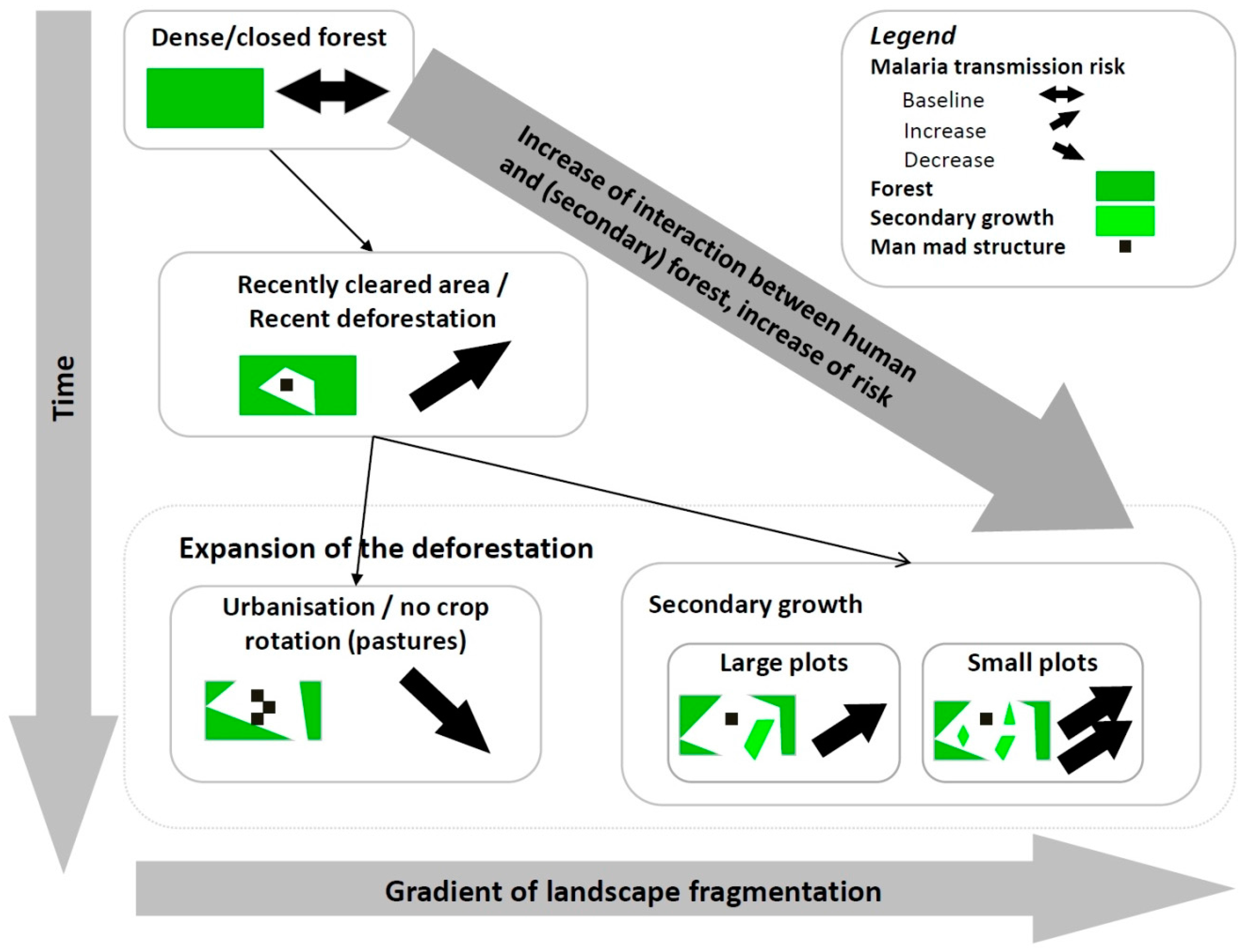 From an ecological standpoint, the knowledge-based model (Figure 2) is likely to represent the following process [14,44] where: (i) deforested areas provide favorable conditions for malaria vector breeding and feeding; and (ii) forest and secondary forest can define resting sites for adult mosquitoes that return to the forest and secondary forest after feeding. Consequently, the more the forest and secondary forest patches interact with deforested patches (situation described in the bottom-right box of Figure 2), the more the landscape is favorable to vectors and vector-human being encounters. Indeed, such landscape tends to maximize the densities of vector breeding (larvae) and resting (adults) sites and facilitate host seeking by shortening the distances between resting sites and hosts, which are preferentially human beings regarding the marked anthropophilic behavior of An. darlingi, the main malaria vector in the region.