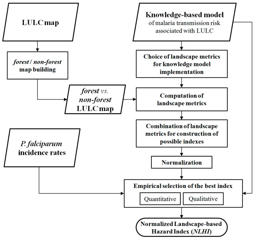 In this context, focusing on the relationship between landscape features and malaria transmission, the present paper proposes to perform the spatialization of the knowledge-based model in order to build a landscape-based malaria transmission hazard index. The method consisted of materializing the knowledge-based model through computation and combination of landscape metrics, using LULC maps derived from remote sensing images. The approach was applied to the cross-border region between French Guiana and Brazil and was evaluated using available malaria incidence data.