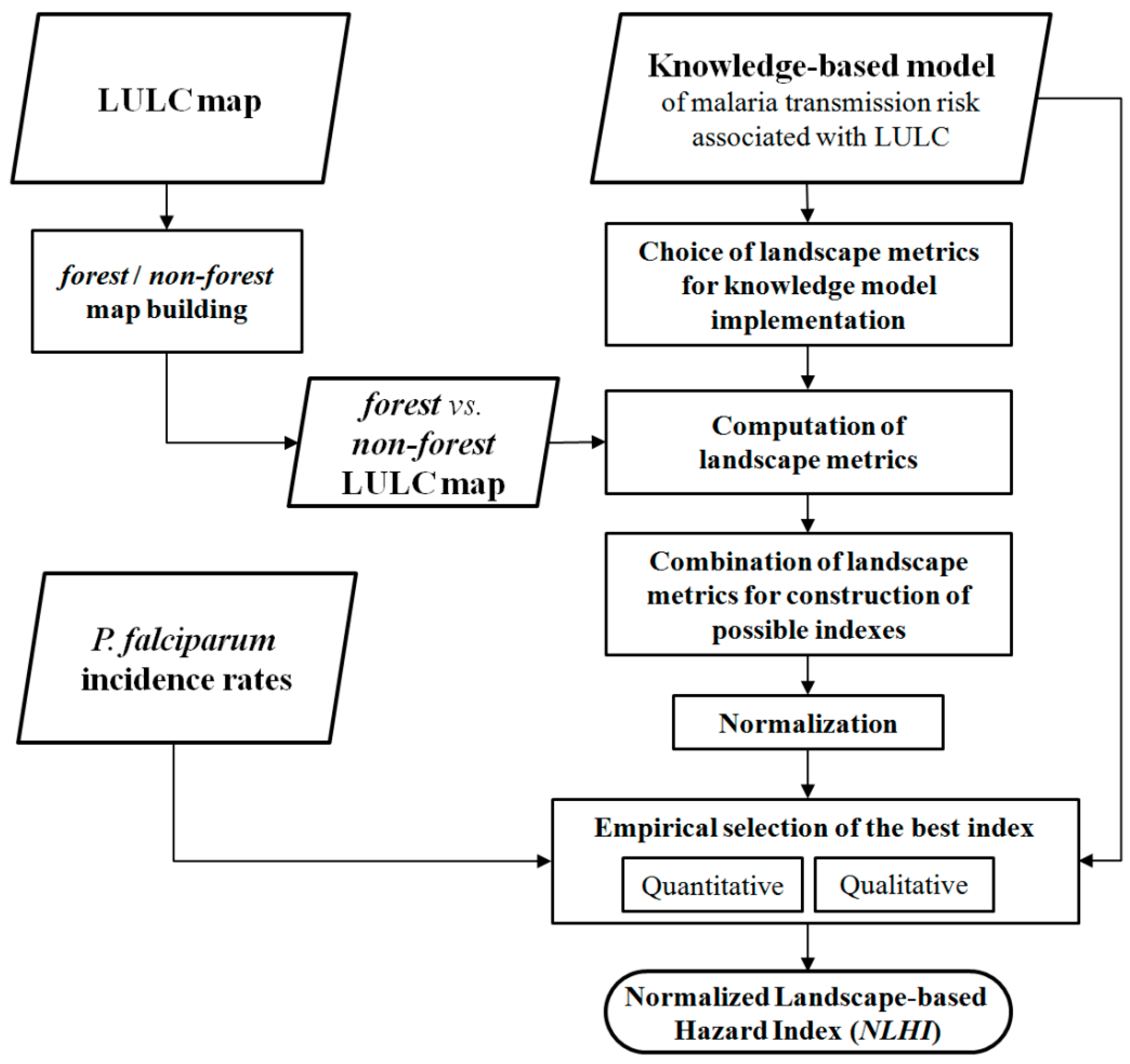 The normalized Landscape-based Hazard Index (NLHI) was then defined for each LHI, varying from 0 (minimum) to 1 (maximum) for the study area: