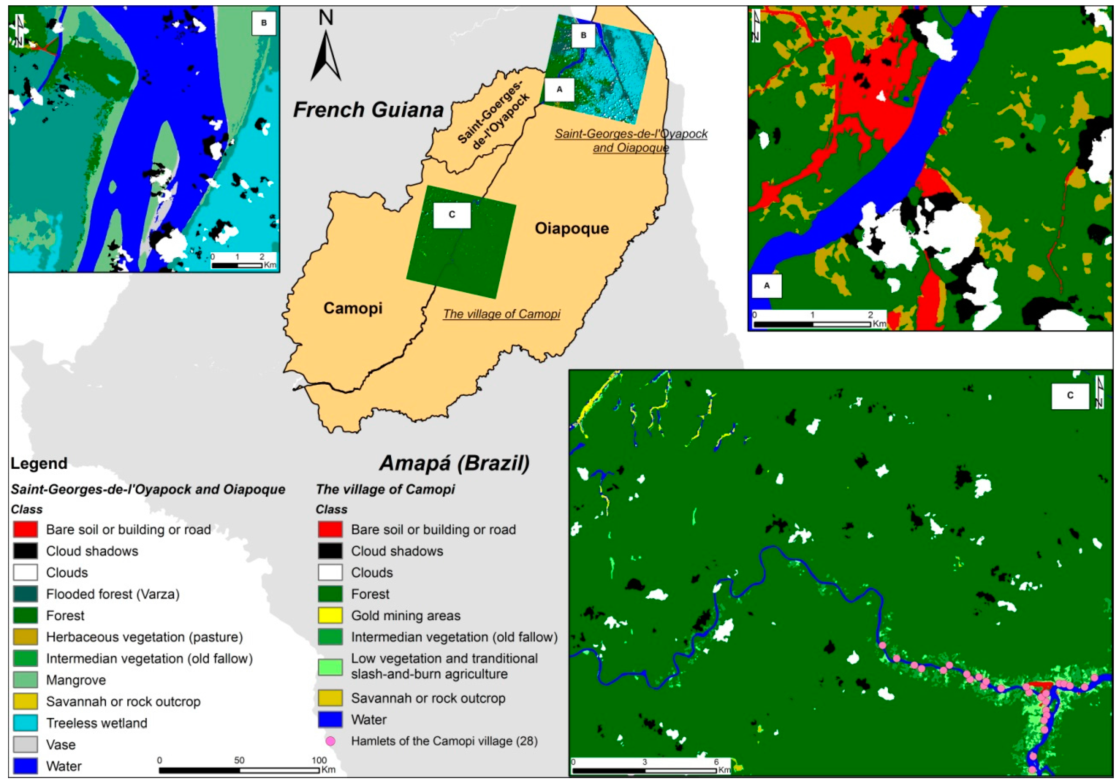 The Saint-Georges-de-l’Oyapock municipality consists of the city of Saint-Georges-de-l’Oyapock and several rural hamlets. Agricultural practices include traditional slash-and-burn agriculture with small plots and cattle farming. The Camopi municipality includes the village of Camopi (with about 1200 inhabitants in a main central hamlet and 28 hamlets within a 15 km2 area, situated along the Oyapock and the Camopi Rivers) and Trois-Sauts (composed by 10 hamlets on the upper Oyapock River). The resident population of Camopi and Trois-Sauts is mainly composed of Amerindians (Wayampi and Teko ethnic groups). Most of the inhabitants live in traditional houses, locally called “carbets”, which are made of wood with a roof of palm leaves, steel sheet, or tarpaulin. The main subsistence activities are hunting, fishing, slash-and-burn agriculture, and the gathering of forest products. On the French side, there are (legal and illegal) gold mining activities that lead to various degree of deforestation and the installation of semi-permanent human structures. On the Brazilian side, the Oiapoque municipality consists of the main city (Oiapoque) with a relatively high level of urbanization, and several rural localities. Agricultural practices include traditional slash-and-burn agriculture with small plots and cattle farming, but also large plots created at the expense of the native dense forest. Several protected areas exist within this cross-border zone, but with different levels of protection and natural sites, generating different land use patterns [38].