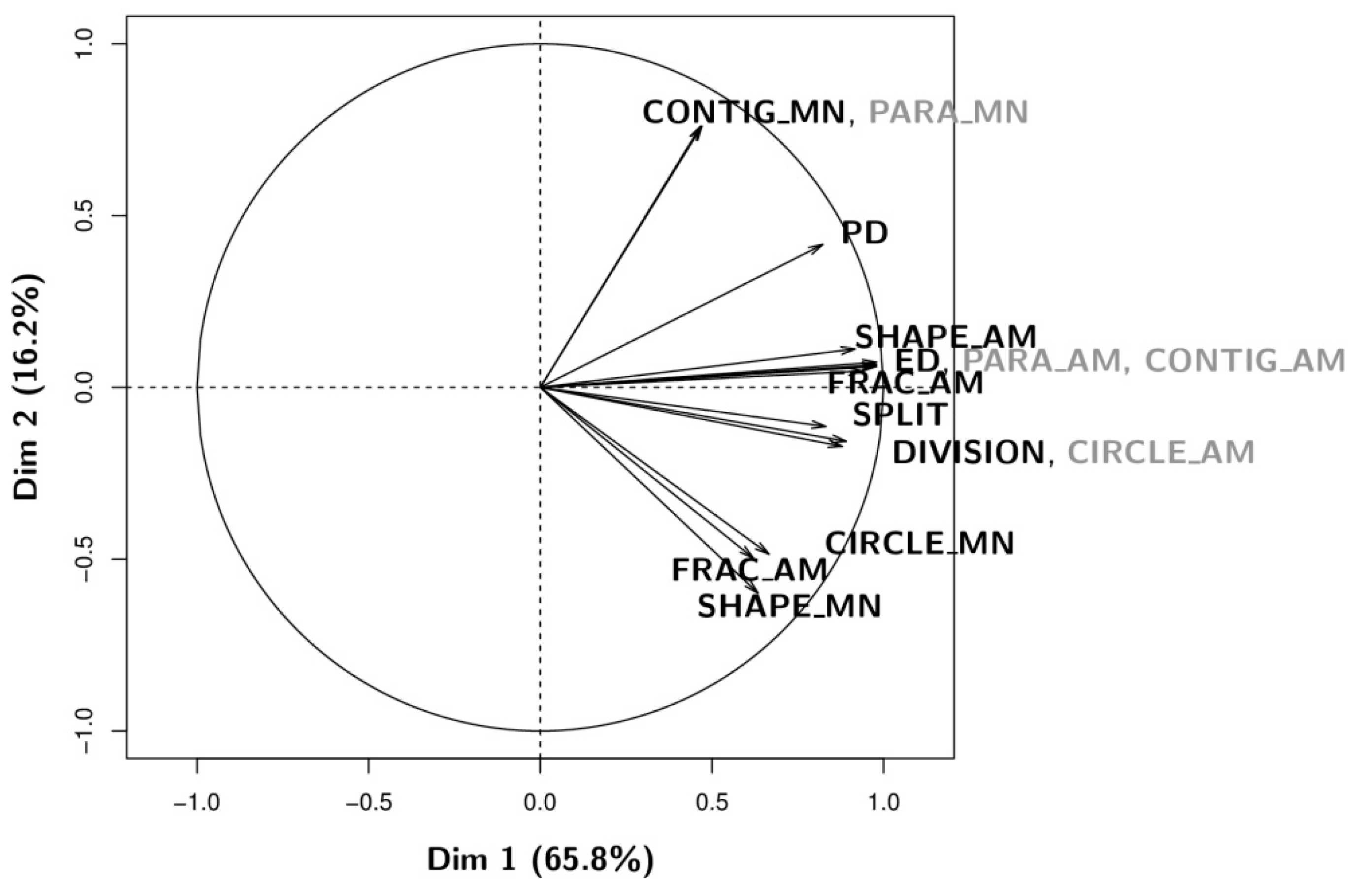 PCA was applied to the pixels of a zone surrounding the village of Camopi in order to compare the information content of the 14 candidate CM. The zone contained more than 50% of the pixels of the entire forest vs. non-forest map of Camopi (more than 2 million pixels), permitting the consideration of all landscape contexts and provide robust PCA results. Figure 5, representing the first plane of the PCA results, shows that 83.86% of the total variance was explained by only two factorial axes, and that three groups of CM exhibited very high intra-group correlations: (i) DIVISION and CIRCLE_AM; (ii) ED, PARA_AM, and CONTIG_AM; and (iii) CONTIG_MN and PARA_MN. Figure 5 also shows that, although each metric was highly correlated to at least one other, some metrics appeared uncorrelated, such as SHAPE_MN and CONTIG_MN and, consequently, conveyed complementary information.