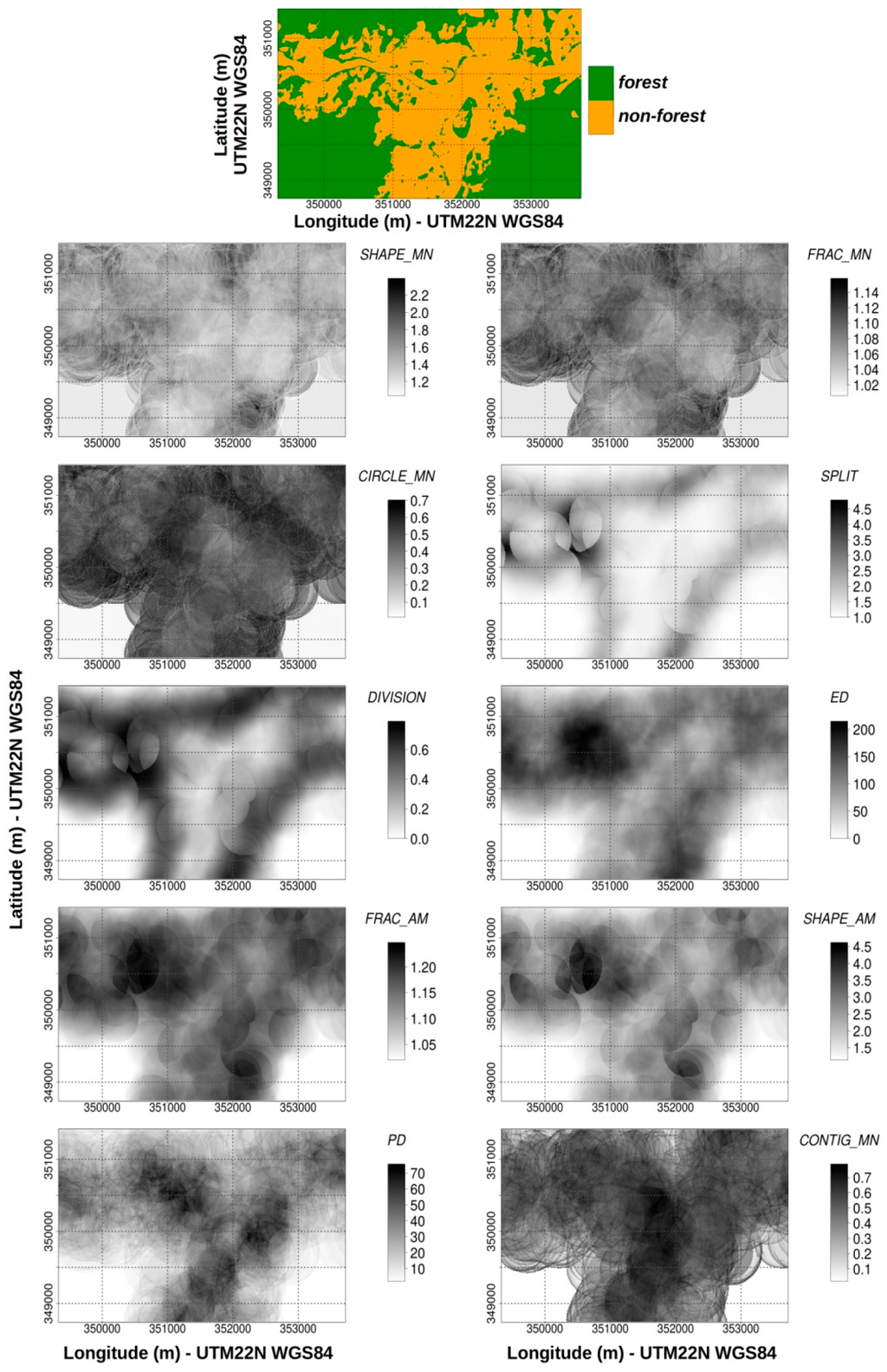 The relative surface of the forest, referred to as pF, was simply obtained by computing the percentage of forest in the computation window (see below for the definition of computation window) (see [45] and Table 1). The landscape configuration is a broader and vague notion related to several metrics (see [45] and Table 1): edge density (ED), patch density (PD), landscape division index (DIVISION), splitting index (SPLIT), perimeter-area ratio (PARA), shape index (SHAPE), fractal dimension index (FRAC), related circumscribing circle (CIRCLE), and contiguity index (CONTIG).