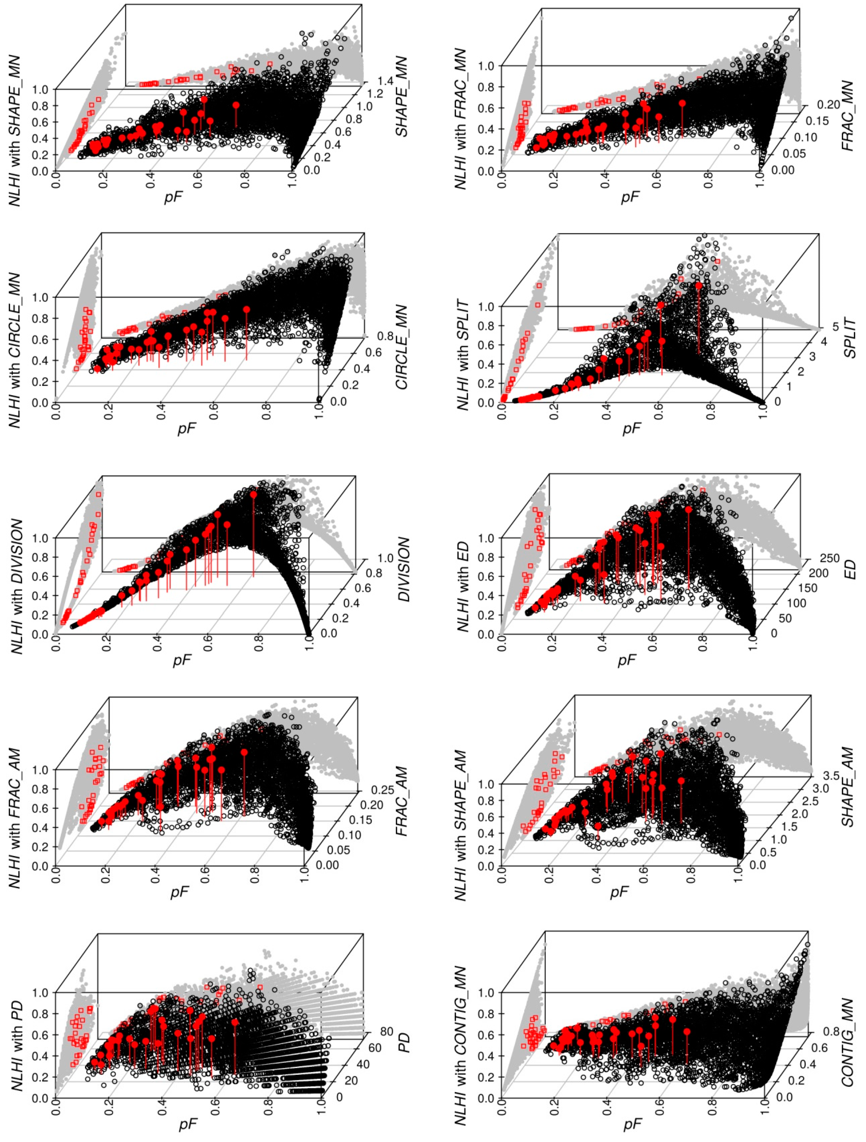 Three-dimensional plots of NLHI as a function of the pF/100 and configurational metrics. The x-axis (horizontal axis in bottom plane), y-axis (axis on the right in bottom plane), and z-axis (vertical axis on the left) represent the pF/100, the candidate CM and the corresponding NLHI, respectively. The gray dots represent the projections onto the xz-plane (back face of the box) and the yz-plane (left face). Red dots with vertical lines correspond to averaged values of the NLHI for the 28 hamlets of the Camopi village. Red squares correspond to the projections onto the xz-plane and the yz-plane of the averaged values for the 28 hamlets of the Camopi village.