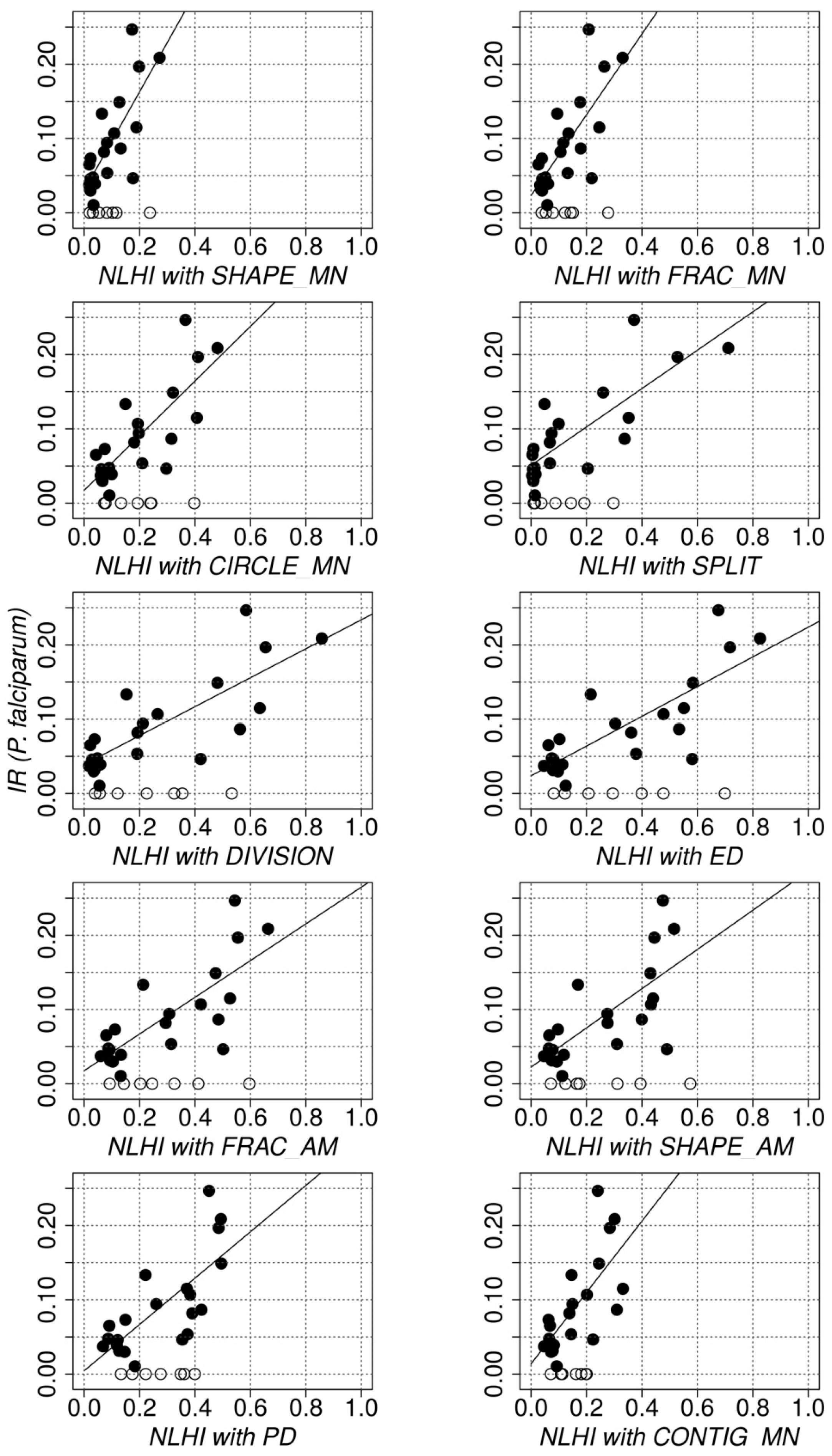 Figure 8 presents the P. falciparum incidence rates for the 28 hamlets of Camopi, as a function of the NLHI values. While all the NLHI seemed to be correlated with the incidence rates (at least for non-null values), some (computed with SHAPE_MN, FRAC_MN, CIRCLE_MN, PD, SHAPE_AM, and CONTIG_MN) exhibited narrow ranges and, consequently, did not seem to significantly discriminate the different landscapes in terms of hazard level, notably for low hazard levels (for instance, NLHI computed with SHAPE_MN). By contrast, the NLHI with DIVISION and the NLHI with ED were more likely to achieve such discrimination.