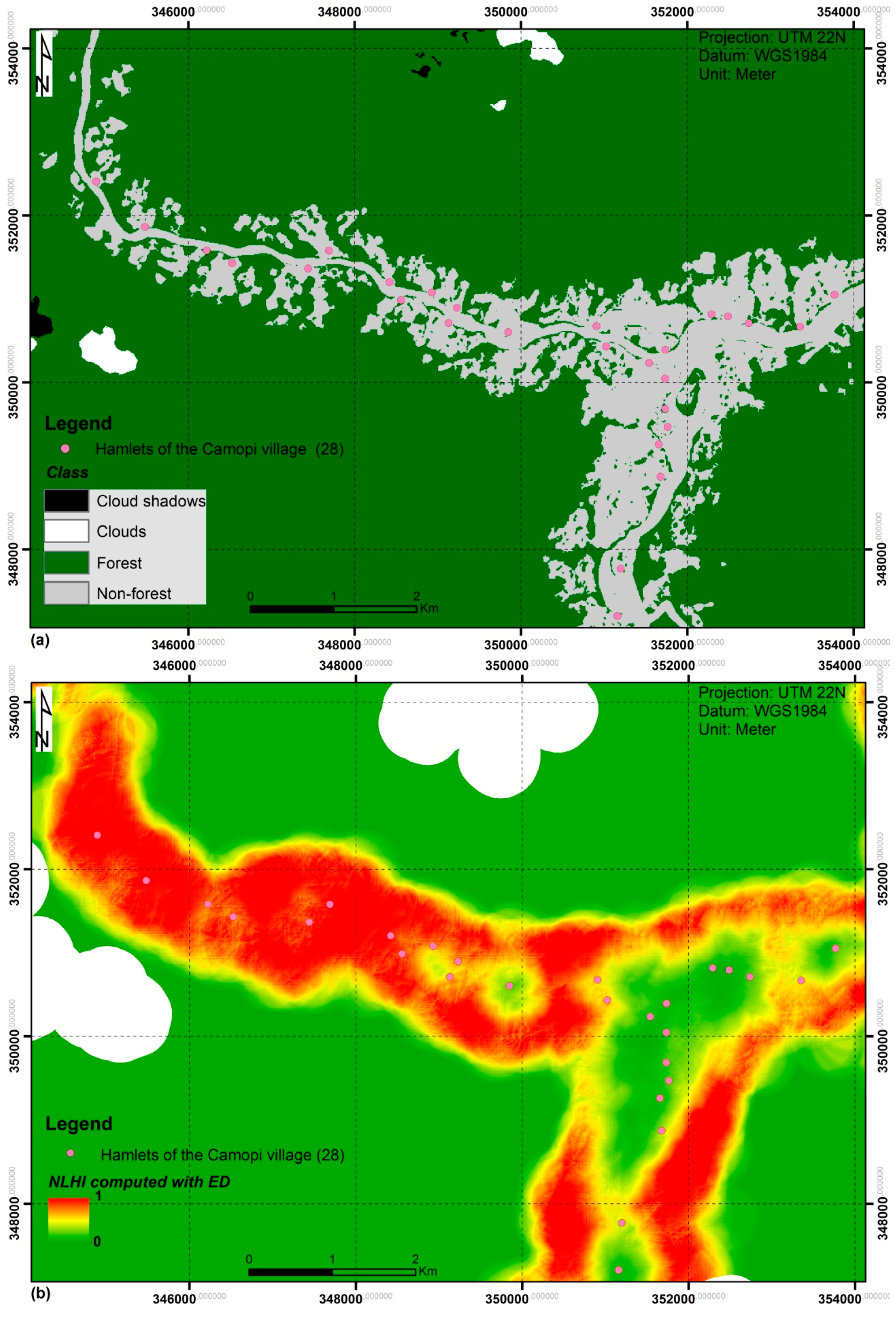 Maps resulting from the application of the proposed method in the region of Camopi. (a) Forest vs. non-forest map; and (b) map of the proposed NLHI (using pF and ED).