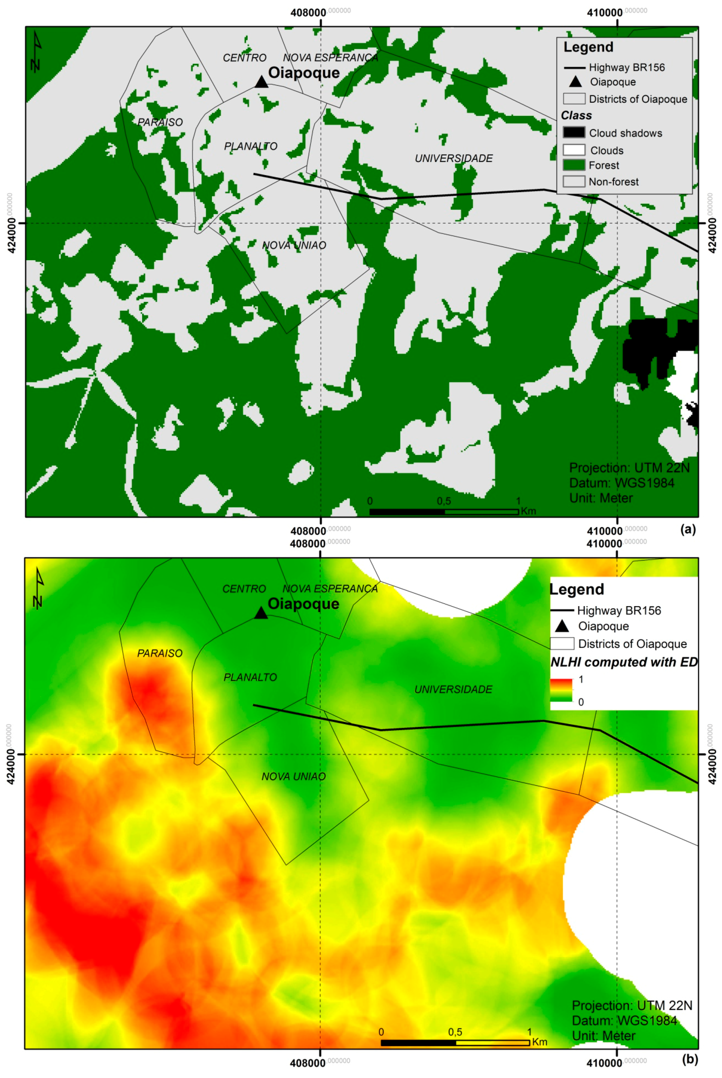 Maps resulting from the application of the proposed method in Oiapoque. (a) Forest vs. non-forest map; and (b) map of the proposed NLHI (using pF and ED). Polygons represent the districts of Oiapoque with their names.