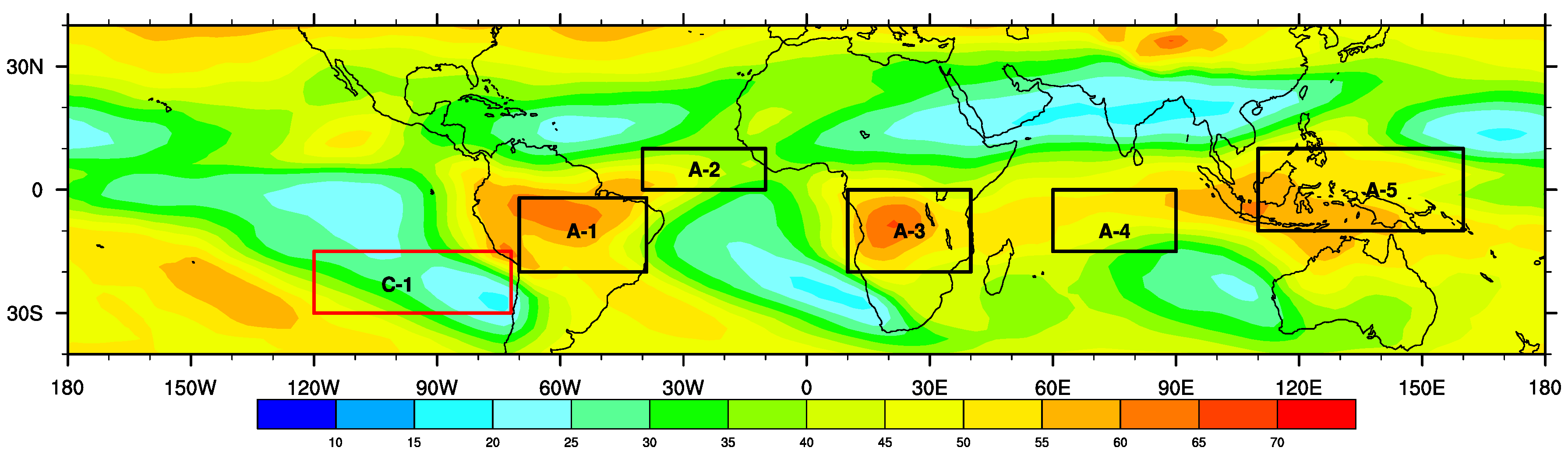 The mean UTH (%RH) values for the month of January 2007 from the CAM-5 model (see text for details). The black rectangles are the regions chosen for looking at the diurnal cycle of UTH from models and observations. The red bordered rectangle is the region selected for calibrating the satellite measurements from microwave data.