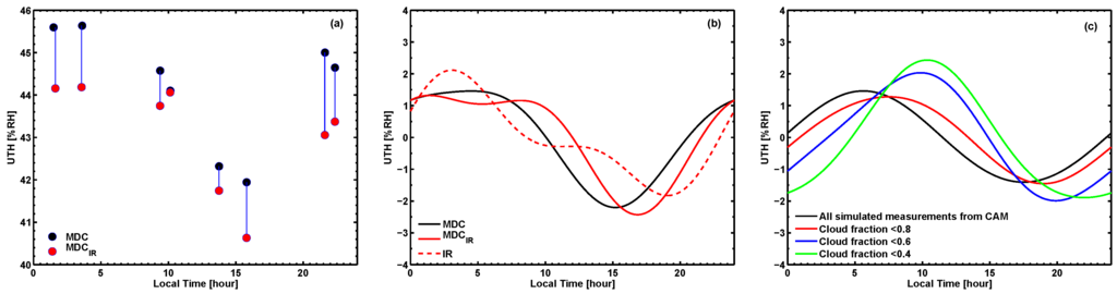 In the CAM-5 model, the cloud fraction at each model layer is defined based on Neale et al. [28] as part of the cloud macrophysical package. It is a relative humidity based threshold value, which is consistent with the stratiform cloud condensate. We averaged the cloud fractions between 200 and 500 hPa layer to get a representative value for the model’s upper troposphere. We constructed the diurnal cycle of UTH from the CAM-5 model by filtering the data for three different values of average upper tropospheric cloud fraction. These threshold values are 0.4, 0.6 and 0.8, and the model data exceeding these thresholds are excluded from the construction of the diurnal cycle. These results are shown in Figure 2c. The diurnal cycle generated without any filtering is also shown. As the figure shows, the diurnal cycle in UTH filtered for cloud fraction 0.8 shows a shift in the diurnal phase of UTH with respect to the unfiltered diurnal cycle by almost the same magnitude as shown by MDC. On the other hand, the diurnal cycle generated with a cloud fraction of 0.4, a typical threshold value used in model and IR UTH comparisons, shows a lag of more than 4 h in the LTMAX and LTMIN with respect to the diurnal cycle created without any filtering.