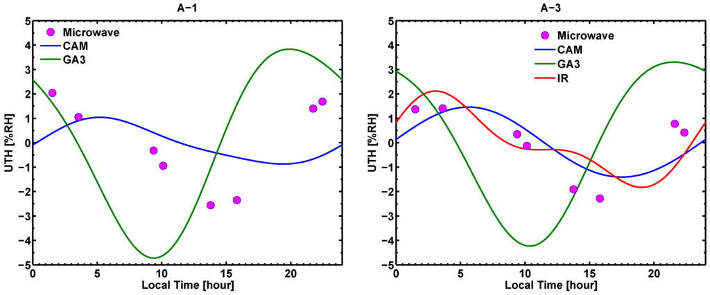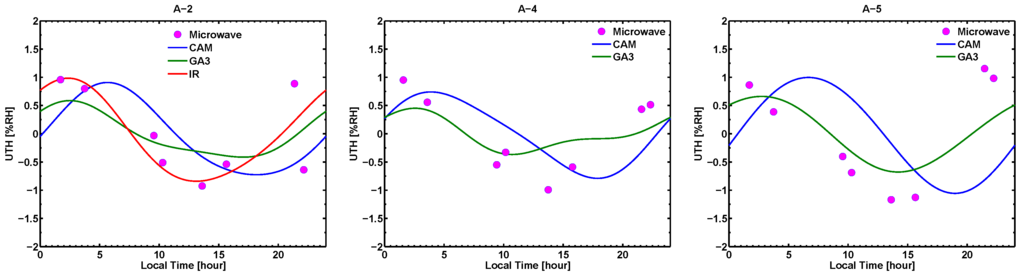 The diurnal cycle of UTH in observations shown for convective land and oceanic regions are in good agreement in terms of the diurnal maximum and minimum values, with much stronger diurnal amplitudes over land regions in comparison to oceanic regions [19,42]. Chung et al. [42] used METEOSAT-8 measurements over A-2 and A-3 to analyze the diurnal cycles of upper and mid-tropospheric humidity in conjunction with the diurnal cycles of clouds and precipitation.