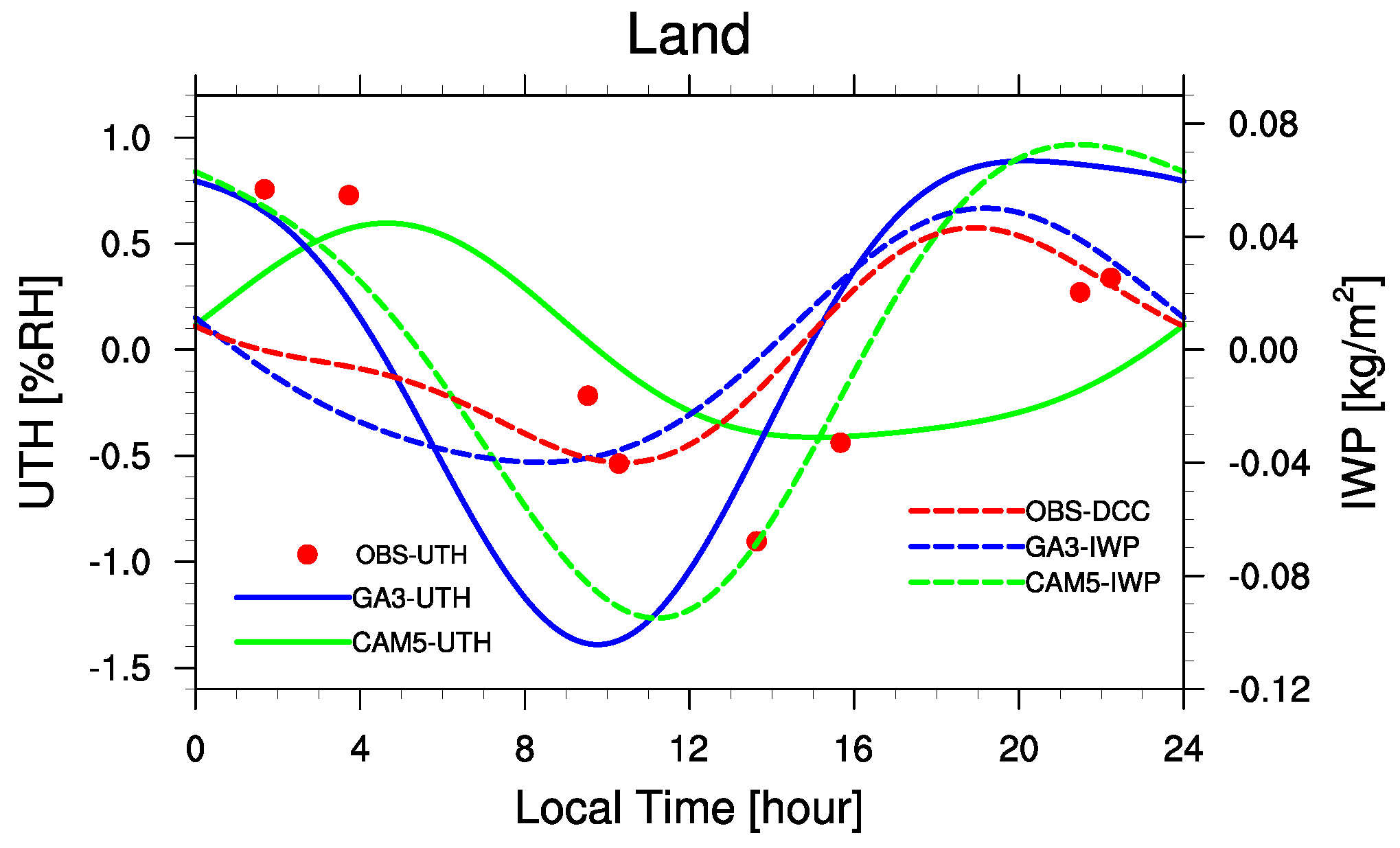 Diurnal cycle of UTH and deep convection in observation and models for January 2007 for tropical land regions. The OBS in the legend stands for observation, DCC for deep convection and IWP stands for Ice Water Path.